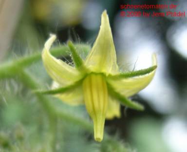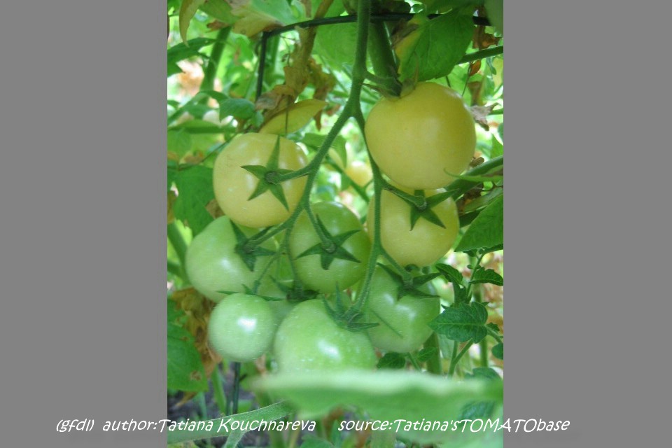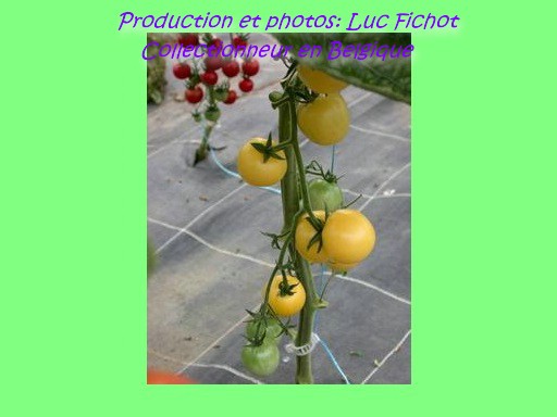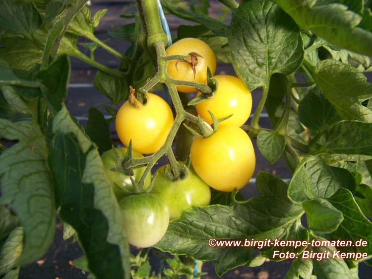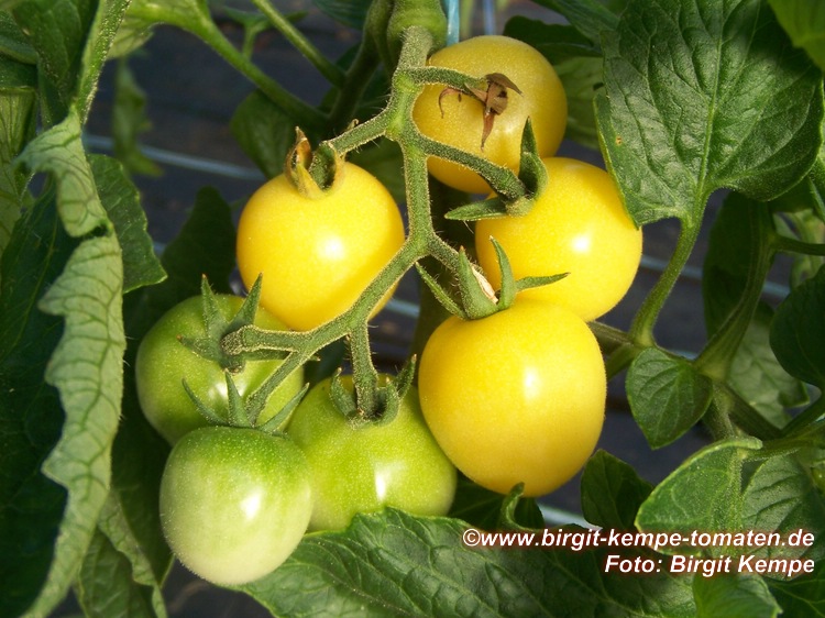 Dr. Carolyn - große Pflanze (über 2,5 m), schlanker Wuchs, dichte Internodien später Erntebeginn (Ende August) mittlerer Ertrag kleine (ø 3 cm und ca. 20 g), runde, hellgelbe Früchte an schönen, gleichmäßigen Rispen sehr angenehmer, süßer Geschmack (Quelle: www.schoenetomaten.de)