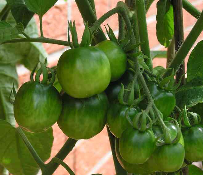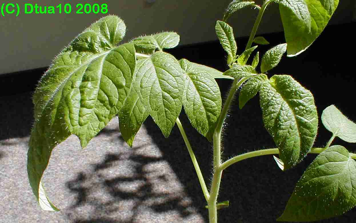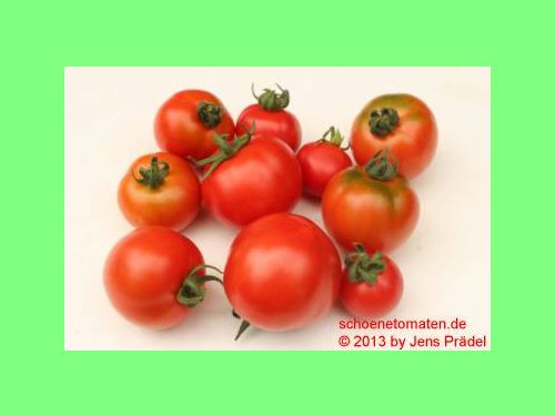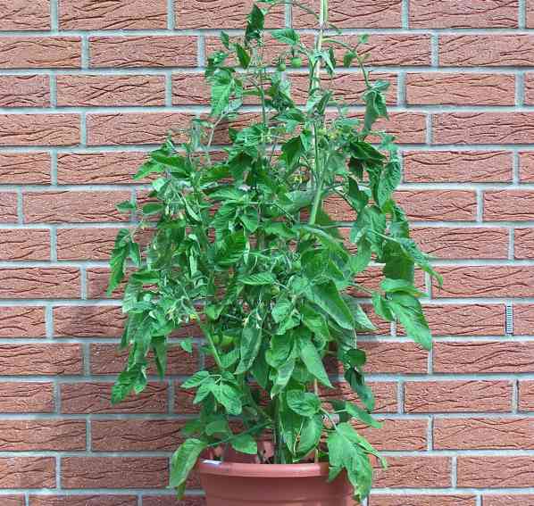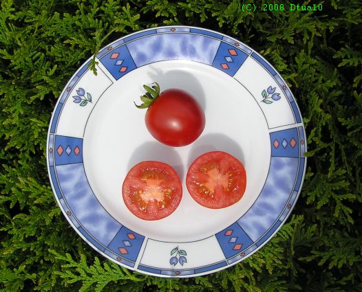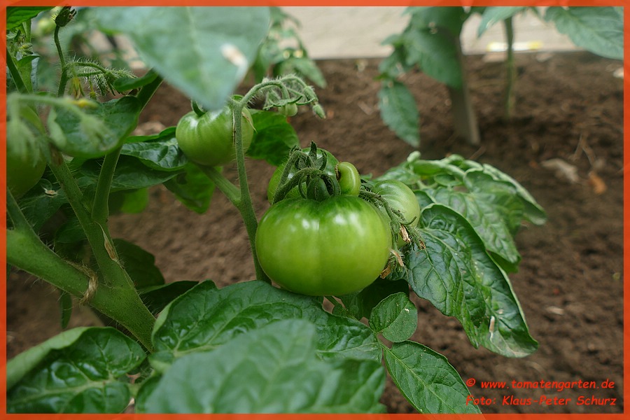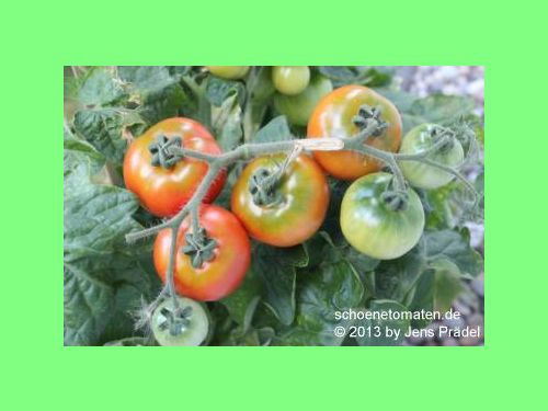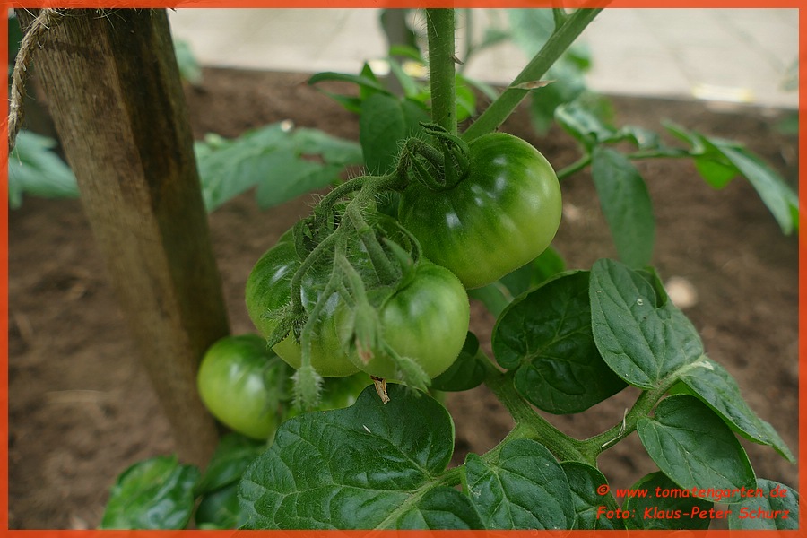 sehr kleine (0,8 bis 0,9 m), kartoffelblättrige, stabil wachsende Pflanze, Buschtomate