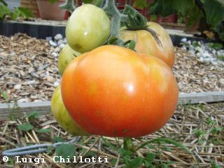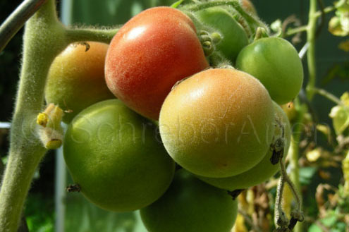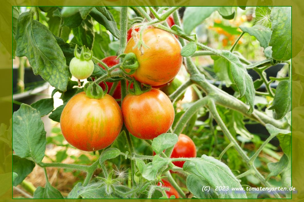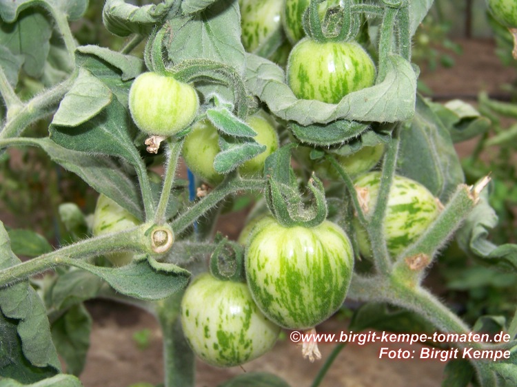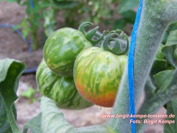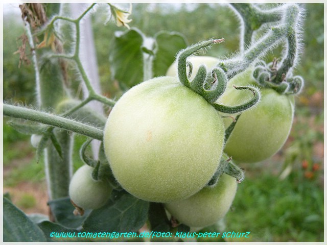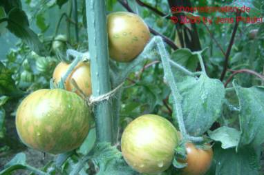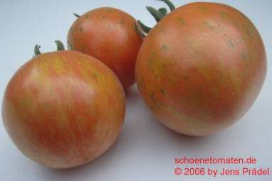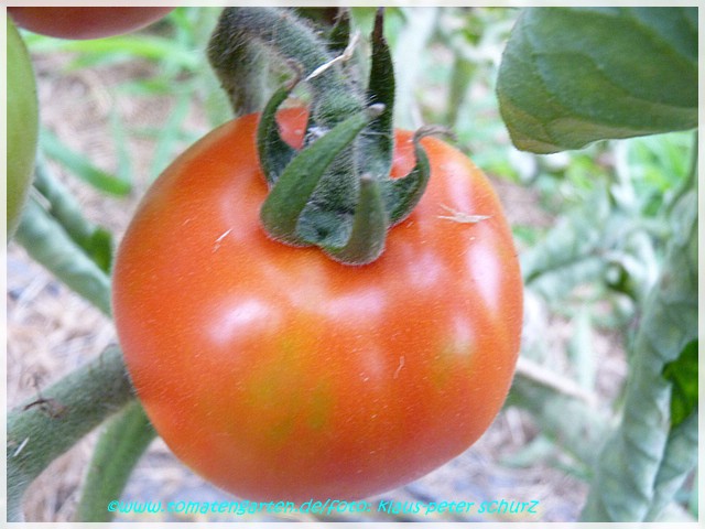 Elberta Girl - kleine, relativ anspruchsvolle und nicht ganz leicht zu ziehende Pflanze (1 bis max. 1,5 m) Alle Pflanzenteile sind pelzig behaart. Wenn man nicht genau hinguckt, könnte man denken, die Pflanze hat Mehltau! später Erntebeginn (Ende August) geringer Ertrag mittelgroße (70 bis 100 g), runde, orangerote leicht behaarte Früchte mit grünlichen, später orangefarbenen Streifen/Flecken saftiger angenehmer Geschmack (Quelle: www.schoenetomaten.de)