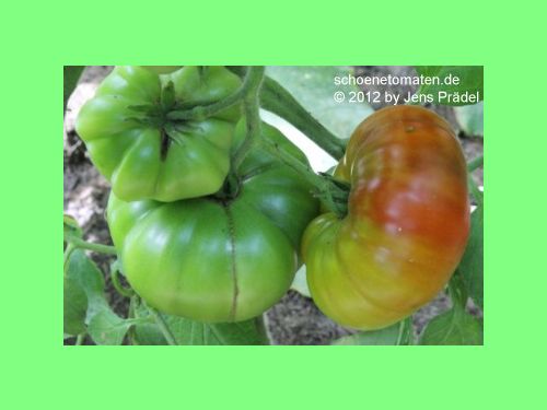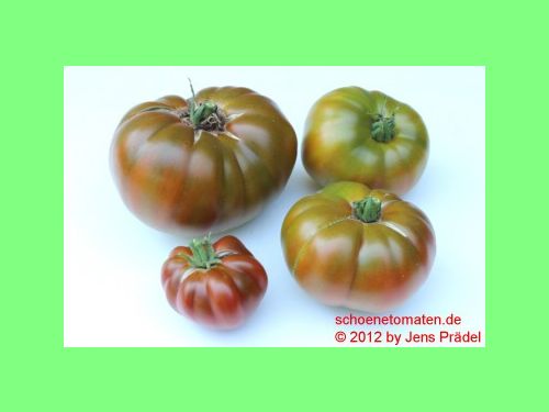 große bis dehr große (ø 8 bis 12 cm), breitrunde, schwach gerippte, braunrote-olivgrüne Früchte