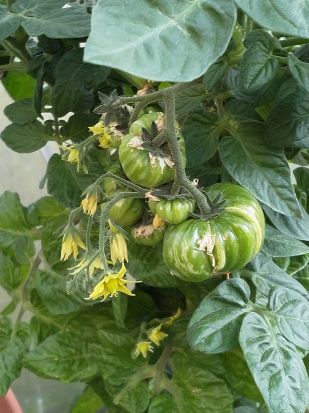 Früchte klein und hängen sehr eng und kompakt zusammen. Unter den ebenfalls sehr kompakt wachsenden Blättern geht es sehr schnell, dass einzelne Früchte komplett verschimmelt sind während die direkten Nachbarn noch unreif sind.