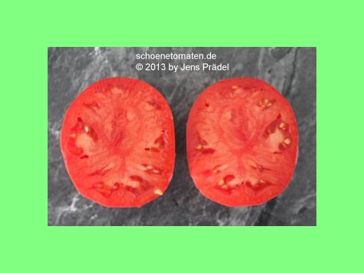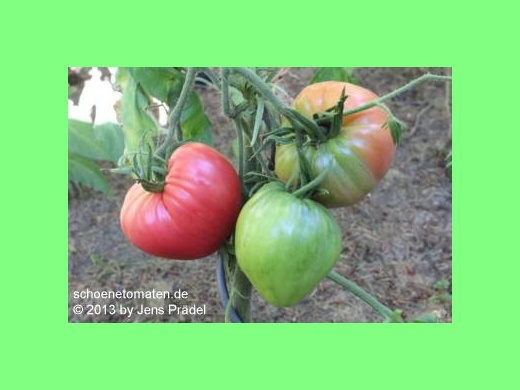 große (ø ca. 8 cm), meist herzförmige, aber auch breitrunde und kegelförmige, nicht sehr tief gerippte, dunkelrote Früchte
