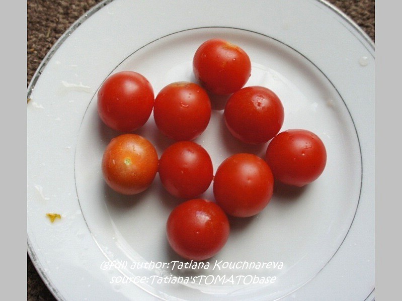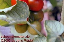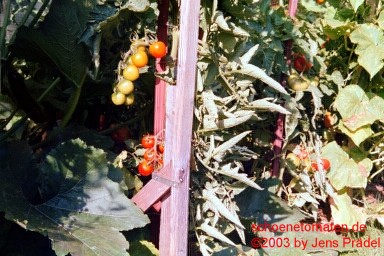 Fence Row Cherry - sehr große Pflanze (bis 2,5 m) mittelfrüher Erntebeginn (Anfang bis Mitte August) gut tragend kleine (ca. 4 cm ø), runde, rote Früchte gleichmäßige Rispen prima Geschmack (Quelle: www.schoenetomaten.de)