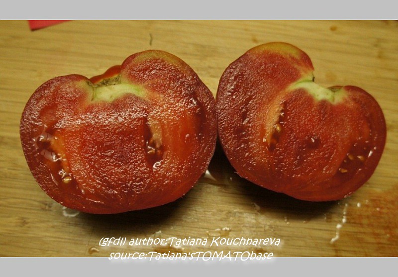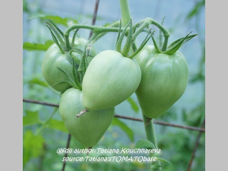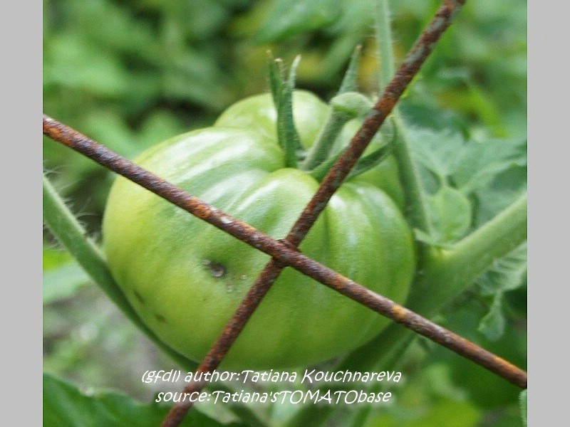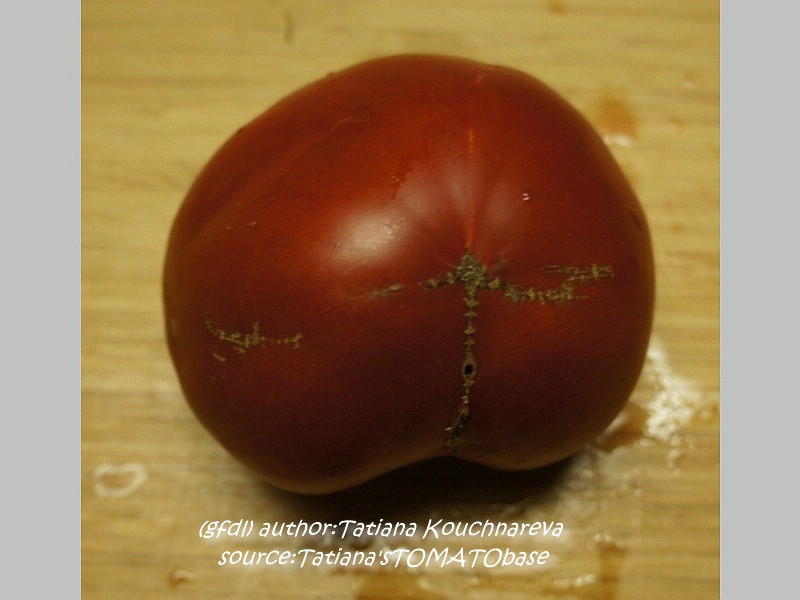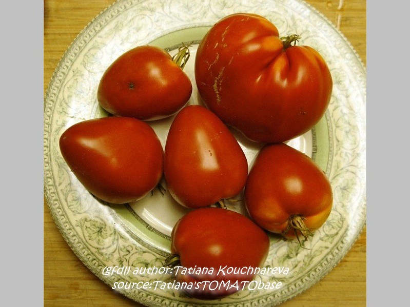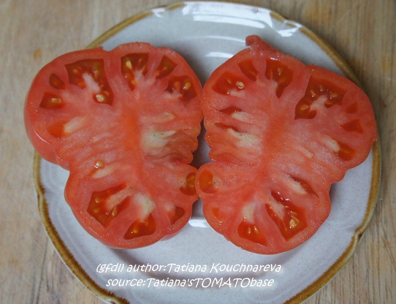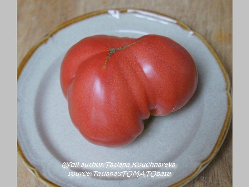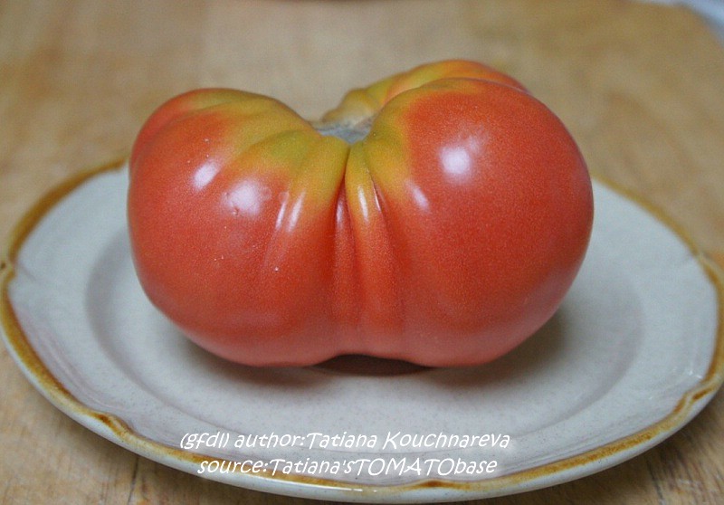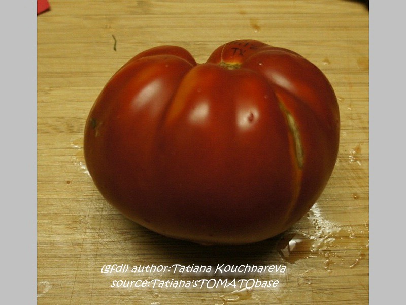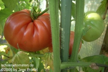 Fritz Ackermann - sehr große (2 bis 2,5 m) Pflanze extrem später Erntebeginn (Mitte September) reicher Ertrag viele sehr große (über 300 g), breitrunde, rosarote Früchte mit tiefen Kerben und Rippen größte geerntete Frucht: 455 g leckerer Geschmack, sehr saftig (Quelle: www.schoenetomaten.de)