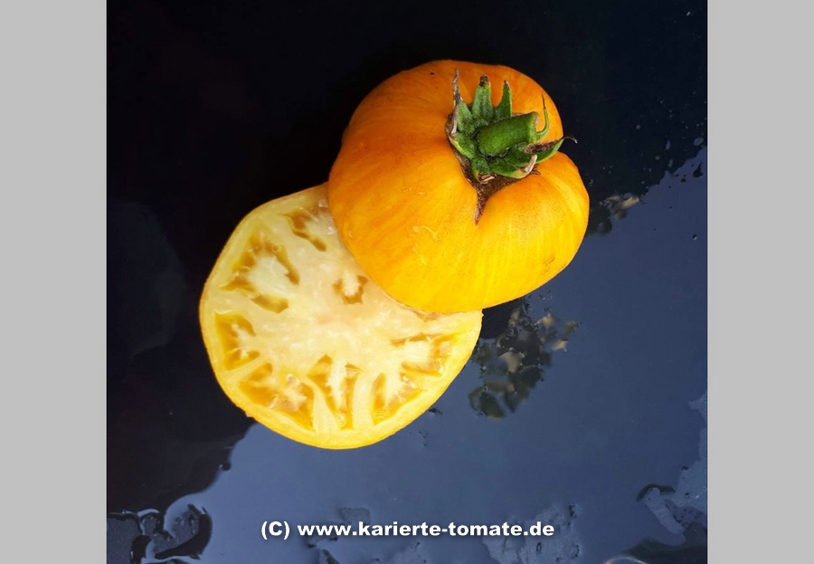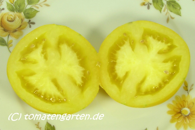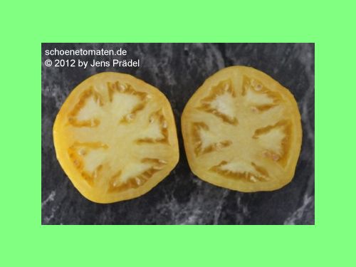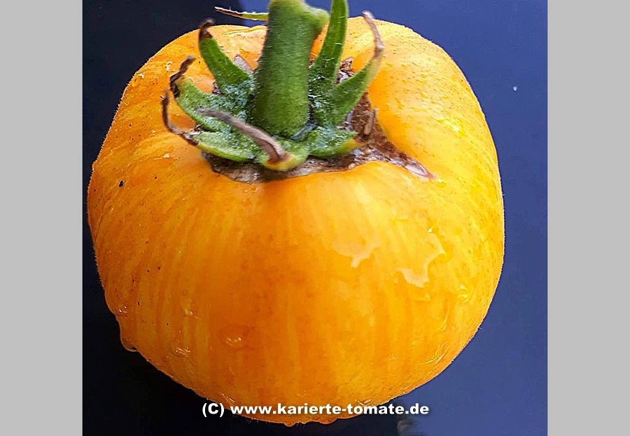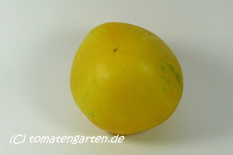 sehr große (ø ca. 6 bis 9 cm), 50 bis 110 g schwere, breitrunde ( ca. 5cm hoch), leuchtend gelbe Früchte mit kleinen, grünen Streifen, die mit zunehmender Reife verblassen