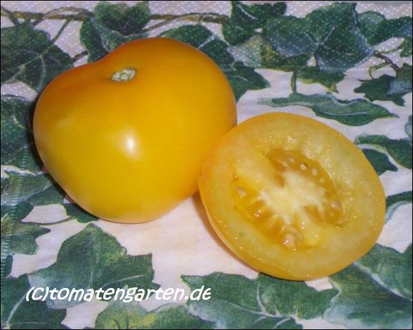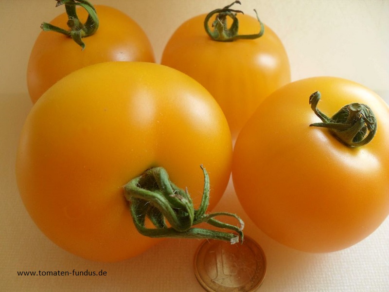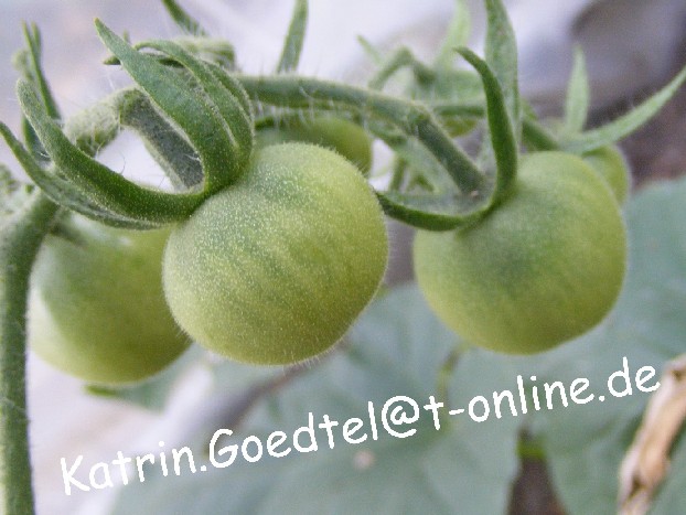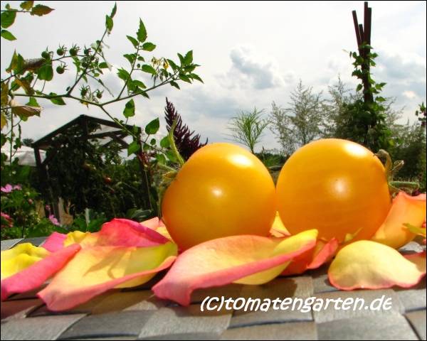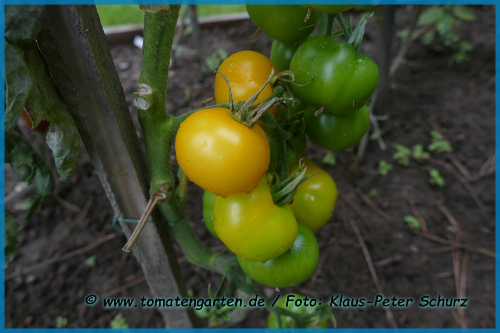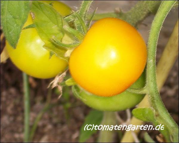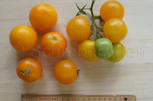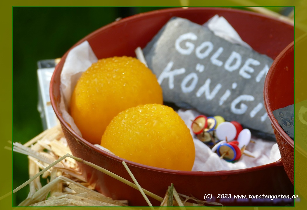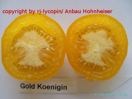 Goldene Königin - mittelgroße (bis 2 m) Pflanze mittelfrüher Erntebeginn (Mitte August) geringer Ertrag (in besseren Tomatenjahren sicher mehr) mittelgroße (ø 4 bis 5 cm, 60 bis 100 g), überwiegend gleichmäßig runde bis leicht flachrunde, dunkelgelbe Früchte, nicht ganz platzfest saftige Früchte mit einem schönen, milden Geschmack (Quelle: www.schoenetomaten.de)
