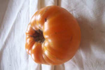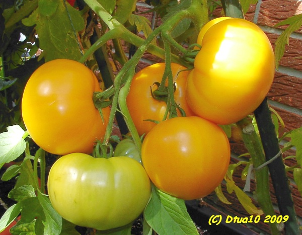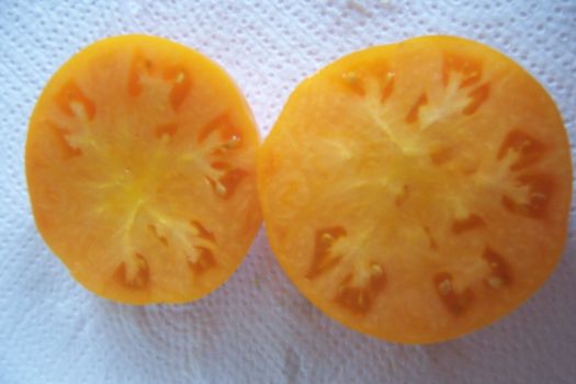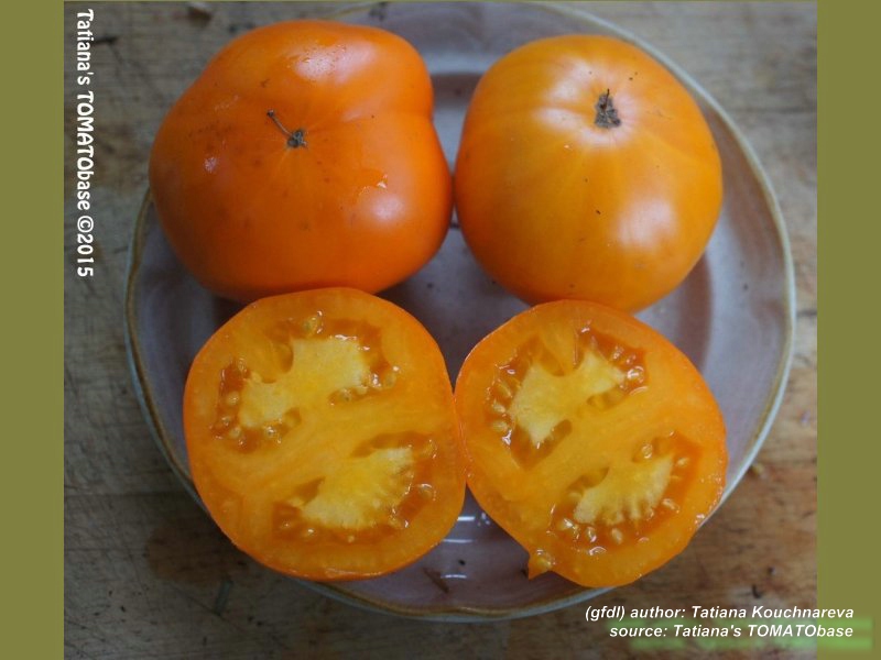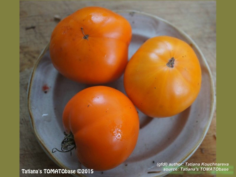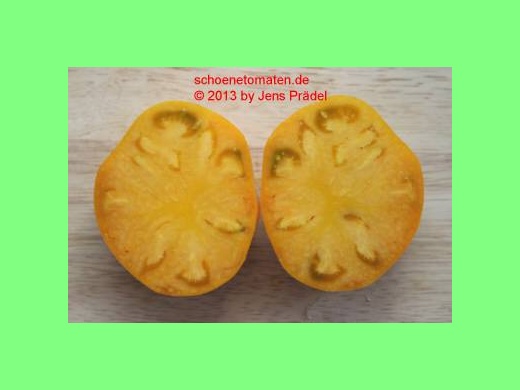 mittelgroße, herzförmige und breitrunde, dunkelgelbe bis orangefarbene Früchte