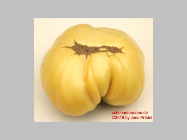 große bis sehr große (ø 9 bis 11 cm, 5,5 bis 6 cm hoch), breitrunde, nur wenig gekerbte, gelbe Früchte