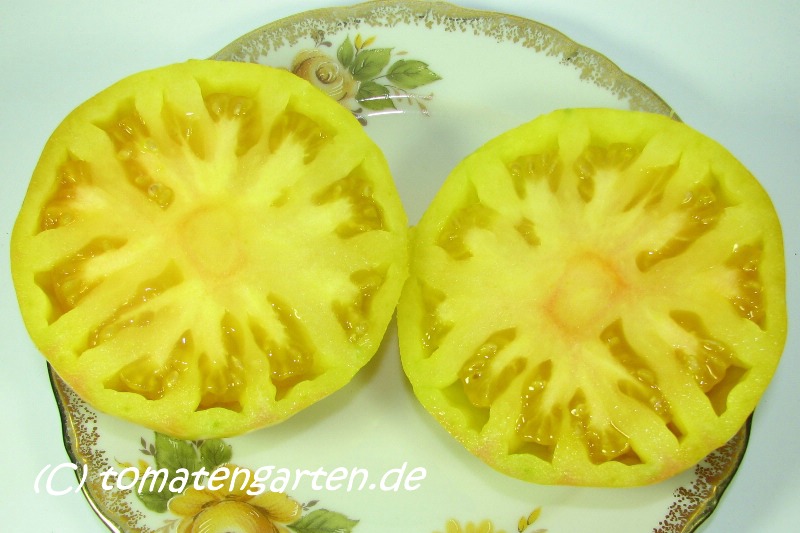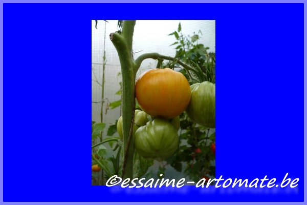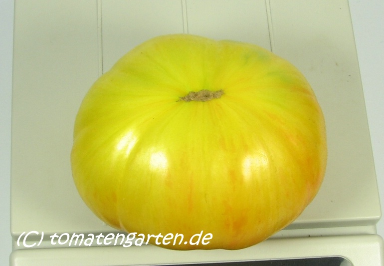 Wenn die Früchte etwas länger hängen bleiben färben sie die hellen Streifen rötlich und die Früchte werden sehr weich, allerdings werden sie auch leicht süsslich dadurch. Die Früchte neigen etwas zur Blütenendfäulnis. Die Früchte wiegen zwischen 200-300g.