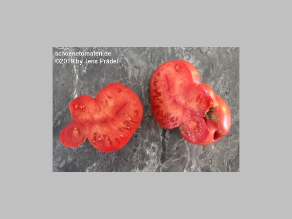 große bis sehr große (ø 7 bis 12 cm, 5,5 bis 6 cm hoch), breitrunde, teilweise herzförmige, pinkrote Früchte