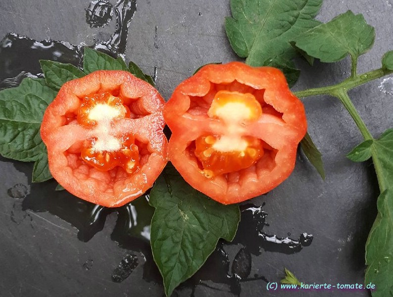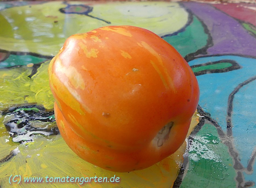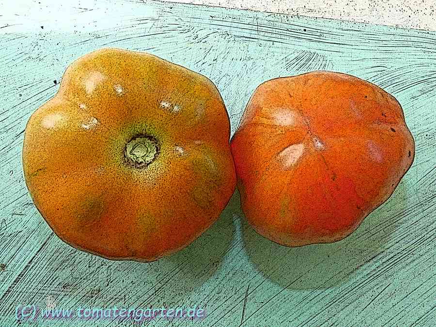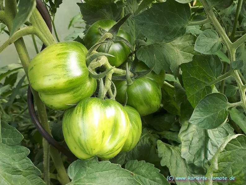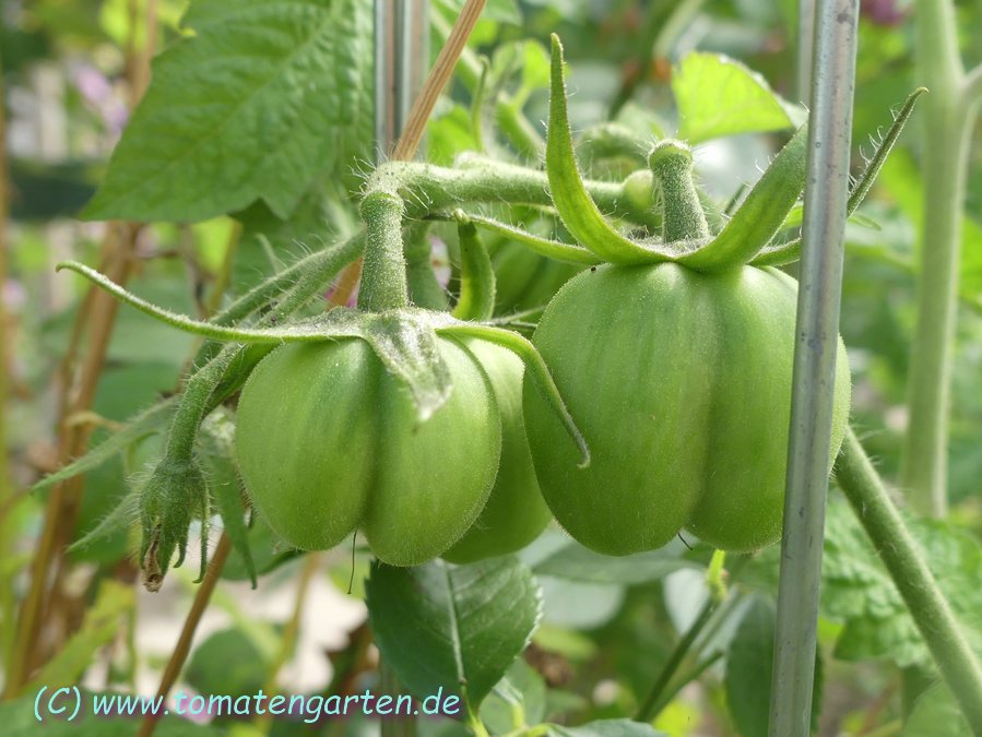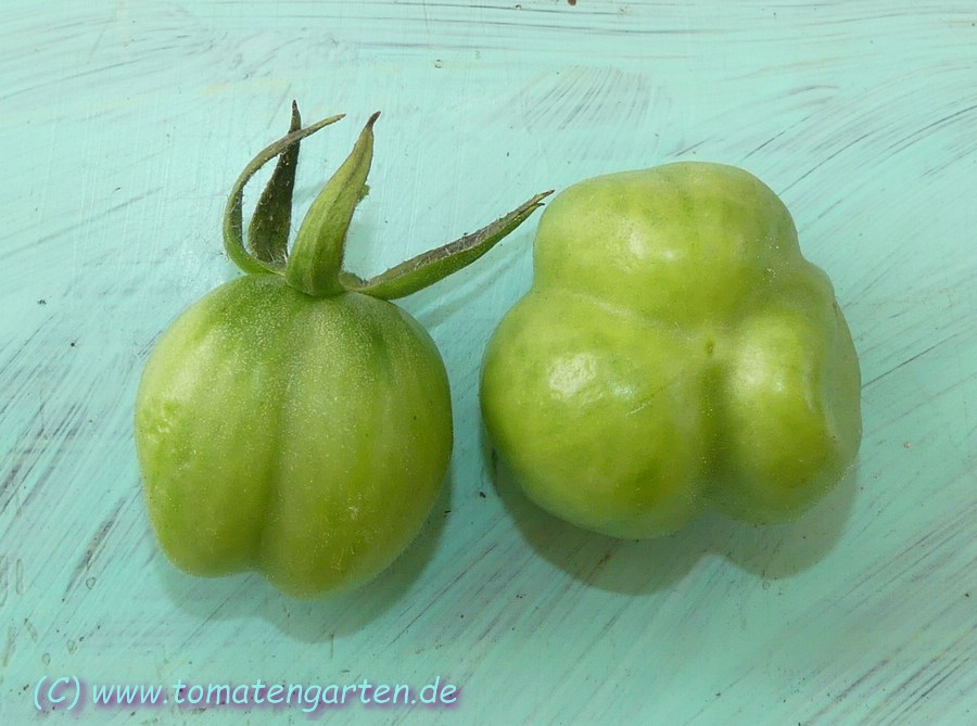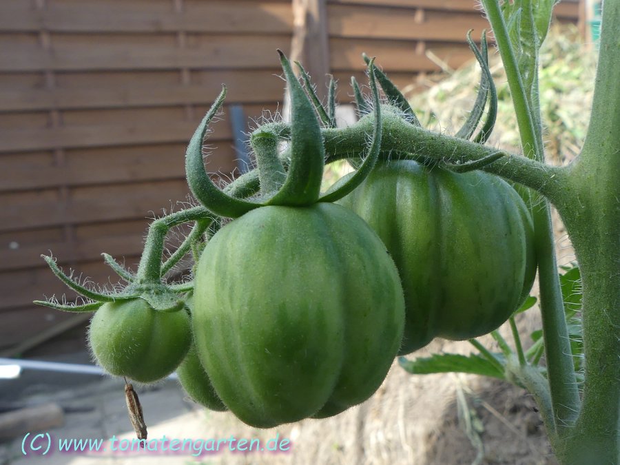 Angebaut 2021 und 2022 im Gewächshaus, Pflanze ca. 170cm hoch und sehr robust, 2triebig gezogen. Sehr hübsche Früchte, ca. 200g schwer, ca. 20 pro Pflanze. Hochrund und unregelmäßig, schwach gerippt. Ernte ab Mitte Juli - im letzten Jahr bis in den November hinein.