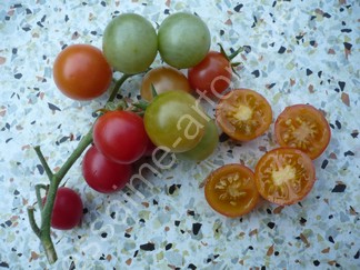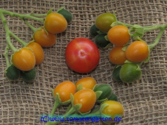 kleine (ø ca. 3,5 cm), etwa 15 bis 25 g schwere, runde, orange-rote Früchte mit meist rotem Blütenpol an relativ kurzen Rispen