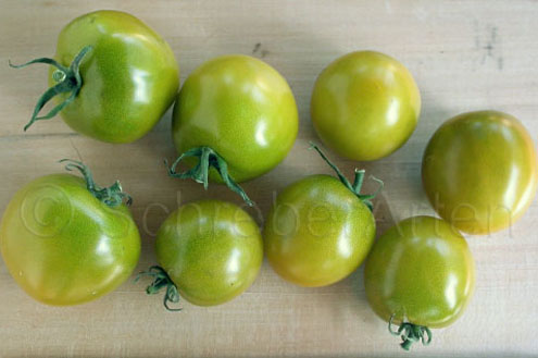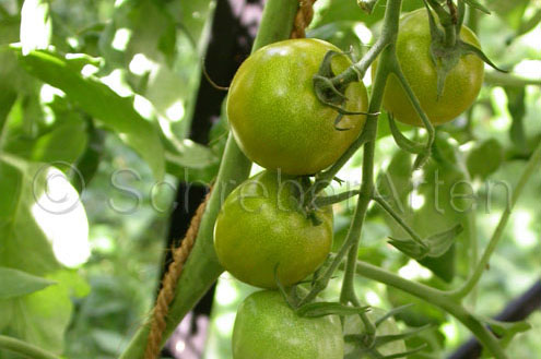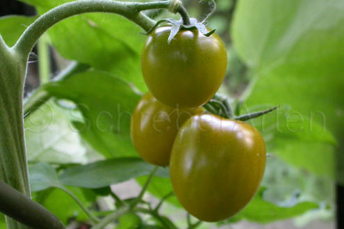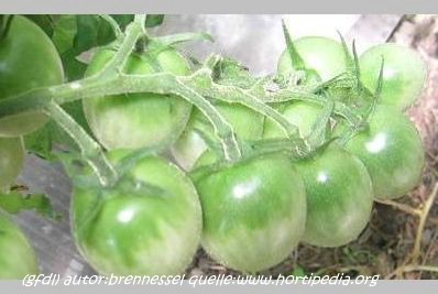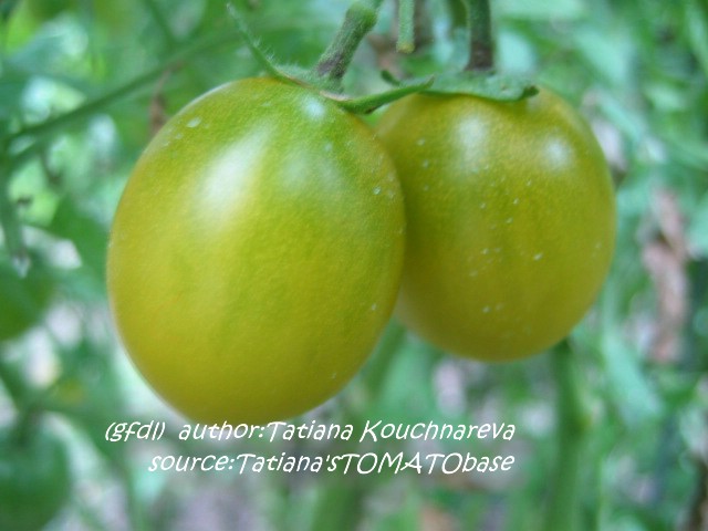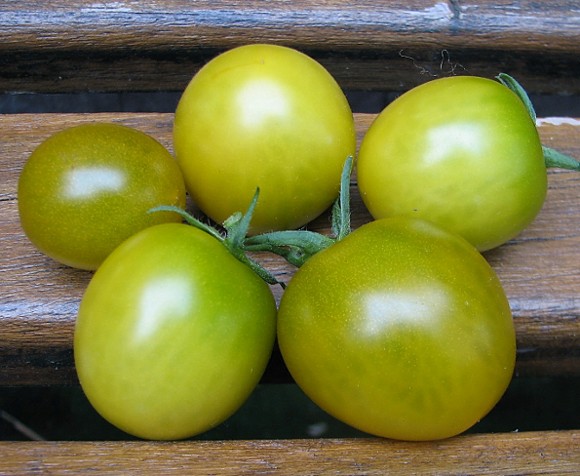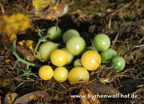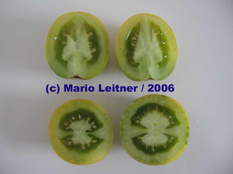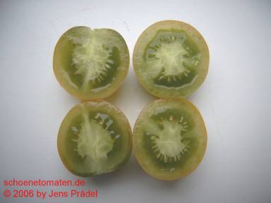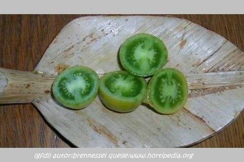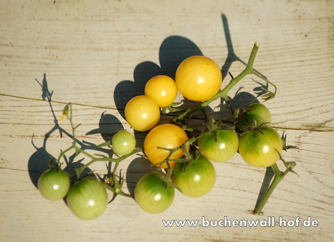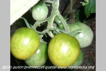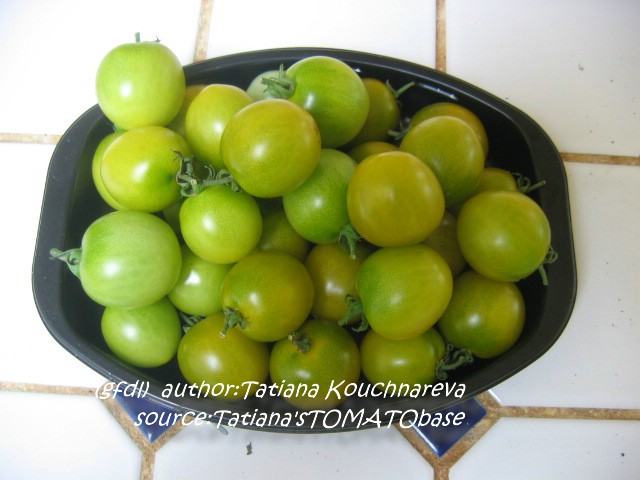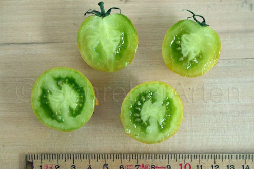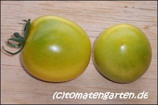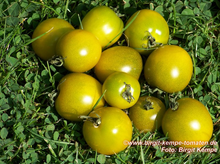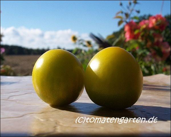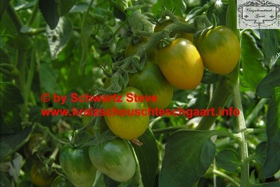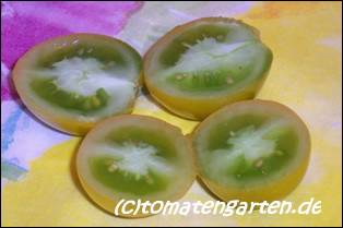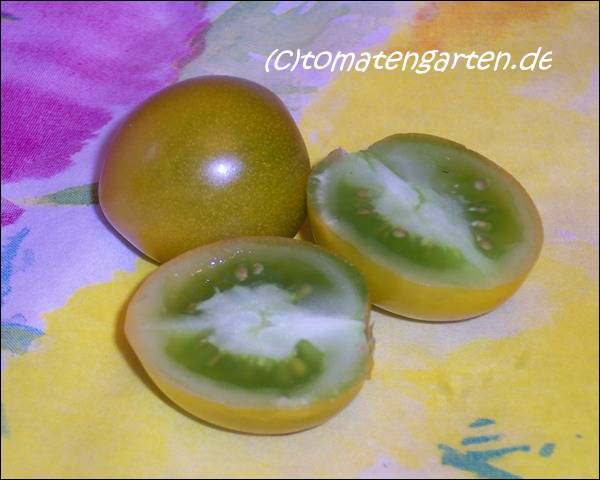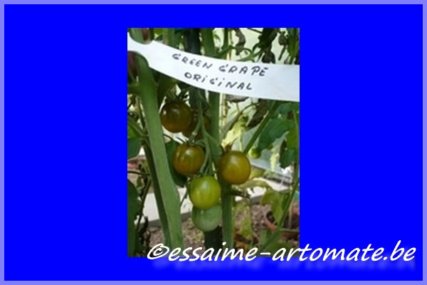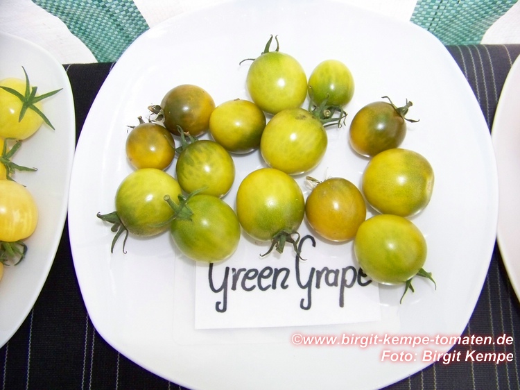 Green Grape - mittelgroße Pflanze (1,5 bis 2 m) früher Erntebeginn (Anfang August) guter Ertrag kleine (ø 4 cm und 20 bis 30 g), runde bis leicht ovale, grün-orangefarbene Früchte (unten orangefarben, oben leicht grünlich) saftig und sehr süß Früchte lösen sich bei Vollreife ganz leicht von der Rispe. (Quelle: www.schoenetomaten.de)