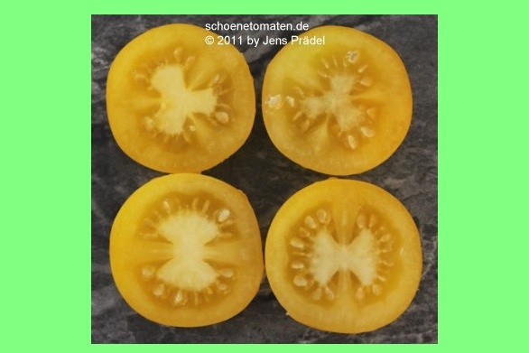 mittelgroße (ø ca. 5 bis 6 cm), 50 bis 70 g schwere, leicht breitrunde, deutlich gekerbte, hellgelbe Früchte, die oft vor der Vollreife über einen kupferfarbenen Kragen verfügen, dann aber wunderbar gleichmäßig durchgefärbt sind.