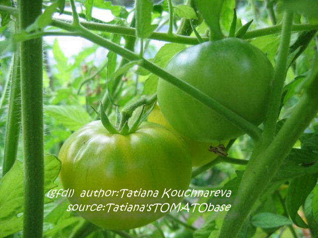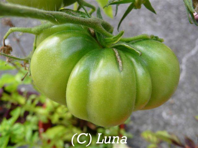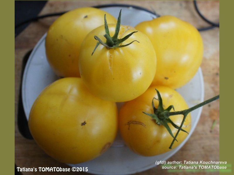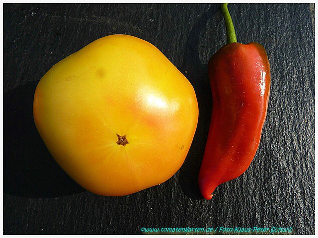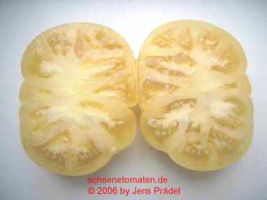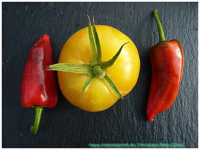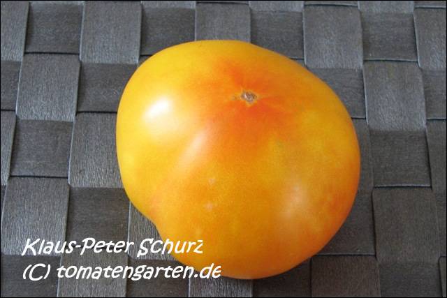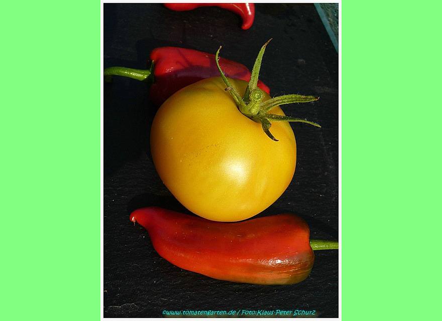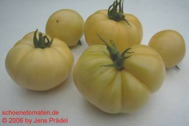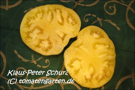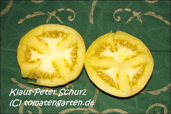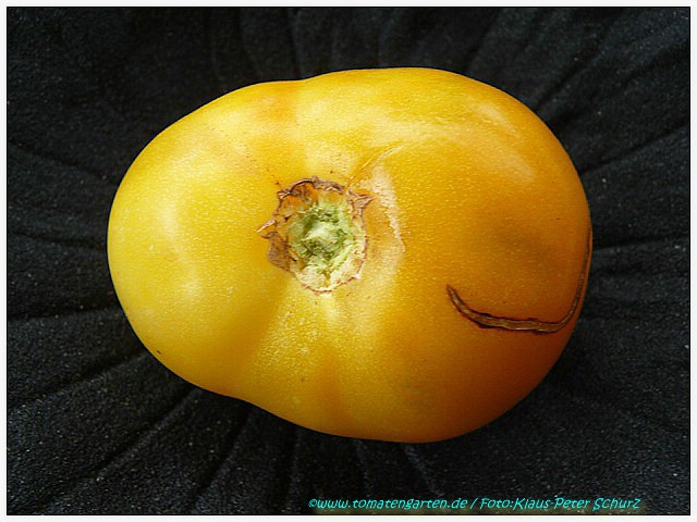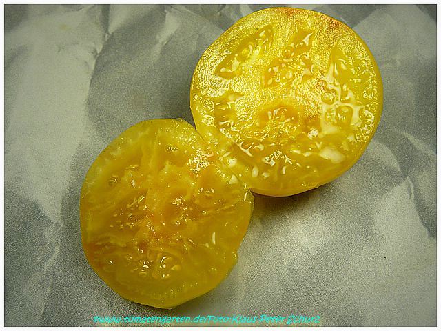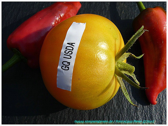 Golden Queen USDA - sehr große Pflanze (bis 2,5 m) mittelfrüher Erntebeginn (Mitte August) überaus reich tragend teilweise sehr große, breitrunde, ganz leicht gerippte, hellgelbe Früchte, wunderschöne ebenmäßige Form größte geerntete Frucht: 427 g milder, angenehmer Geschmack eine prächtige Sorte! (Quelle: www.schoenetomaten.de)