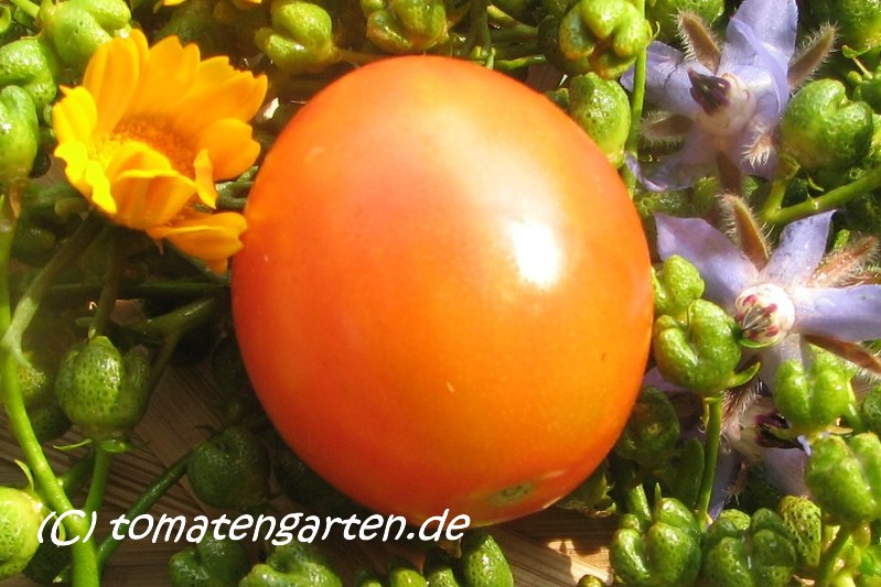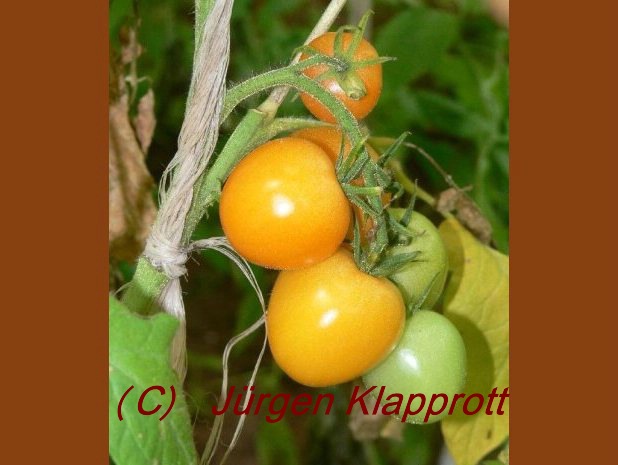 Golden Glow - sehr große Pflanze (2 bis 2,5 m) früher Erntebeginn (Ende Juli) überreich tragend mittelgroße (60 bis 80 g), runde, leuchtend orangerote Früchte prima Geschmack, saftig (Quelle: www.schoenetomaten.de)