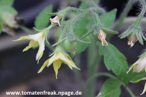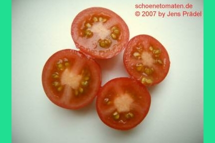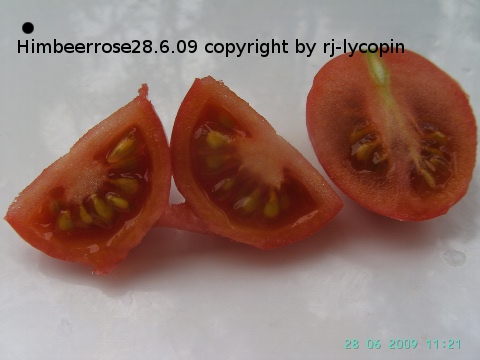 Himbeerrose - sehr kleine Pflanze (knapp über 1 m) mittelfrüher Erntebeginn (Mitte August) mittelmäßiger Ertrag kleine bis mittelgroße, eiförmige, goldgelbe, feste Früchte mittelmäßiger Geschmack, saftig (Quelle: www.schoenetomaten.de)