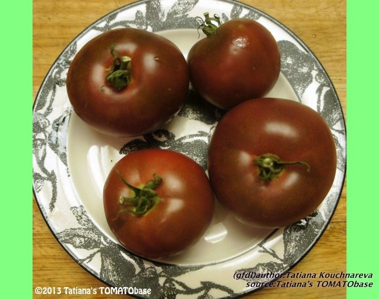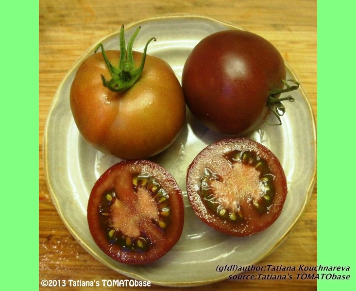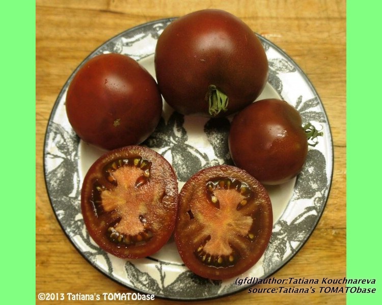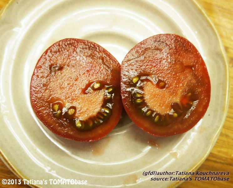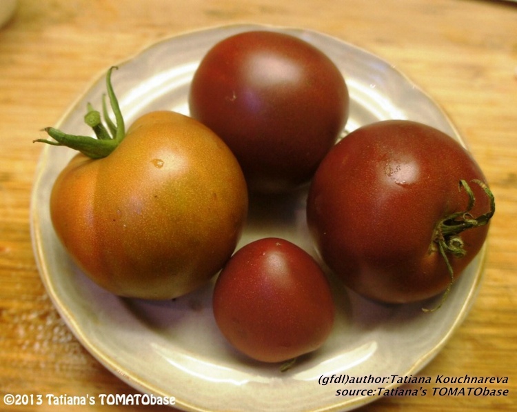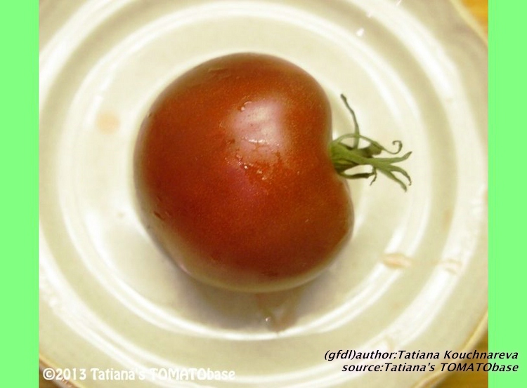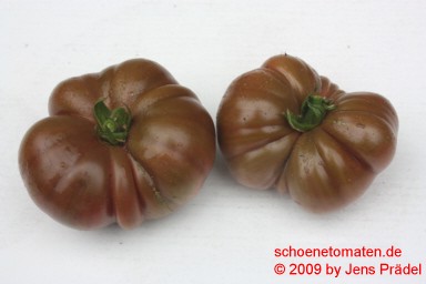 mittelgroße, breitrunde, kräftig gerippte, außergewöhnlich schokoladenbraun bis braunrot gefärbte Früchte meist mit deutlichem Nabel am Blütenpol
