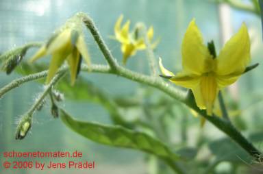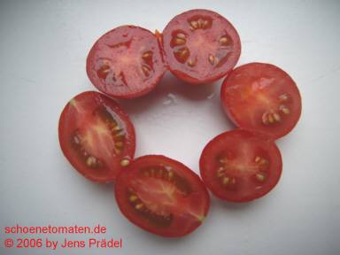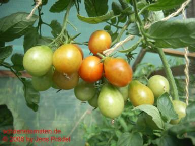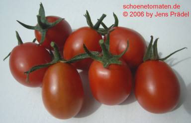 Harlequin - sehr große Pflanze (2,5 bis 3 m) sehr früher Erntebeginn (Ende Juli) langanhaltender reicher Ertrag kleine (4cm hoch und 3 cm breit), birnen- oder tropfenförmige, feste, rote Früchte mit umgedrehtem Kelch, wie eine Narrenkappe (daher der Name), platzfest angenehmer süßer Geschmack eine Hybrid-Sorte, trotzdem sehr empfehlenswert! (Quelle: www.schoenetomaten.de)