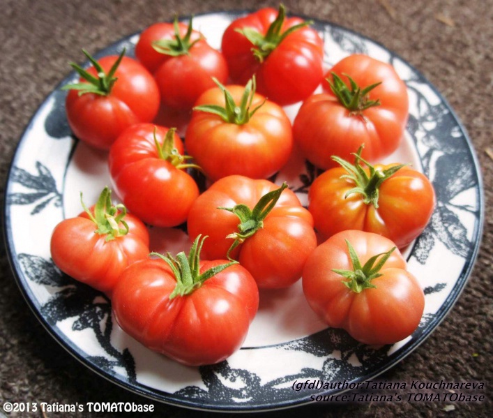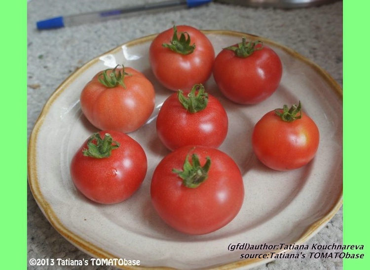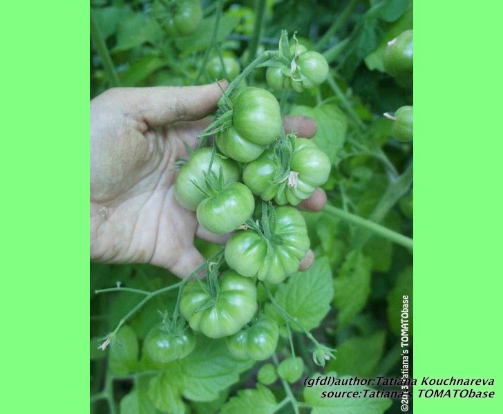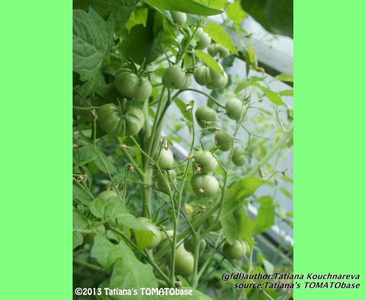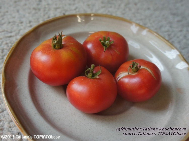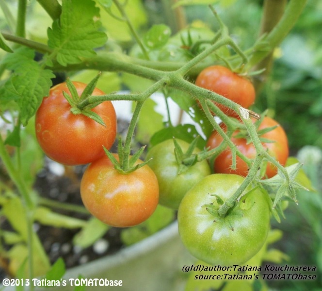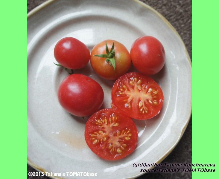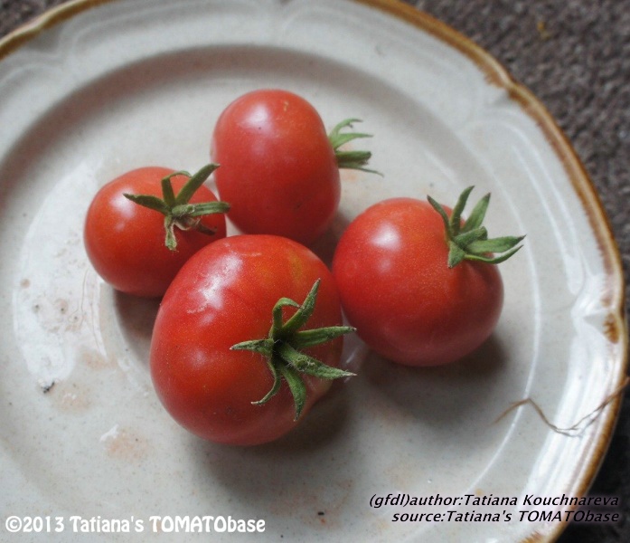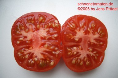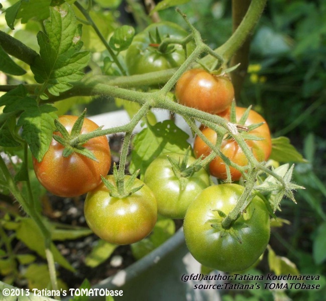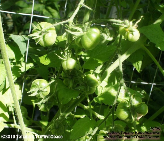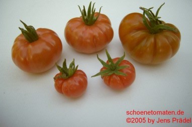 Hank - sehr große Pflanze (2 bis 2,5 m) sehr später Erntebeginn (Ende August) reich tragend sehr kleine (30 bis 40 g), breitrunde, gerippte, rote Früchte teilweise auch ungewöhnliche Formen Eine der kleinsten Fleischtomaten! kräftiger säuerlicher Geschmack (Quelle: www.schoenetomaten.de)