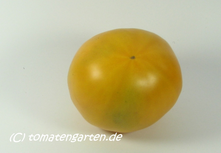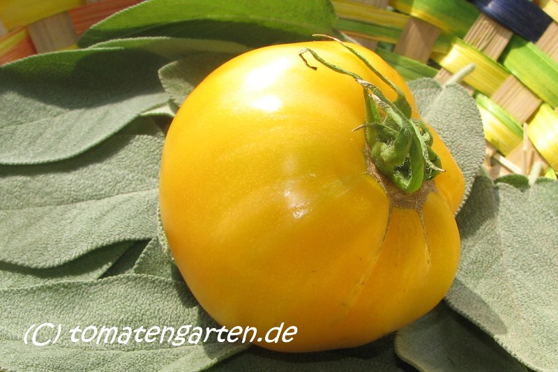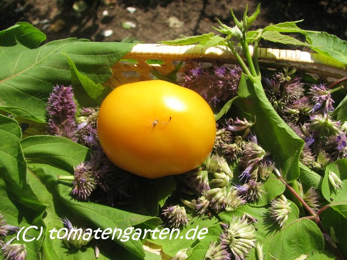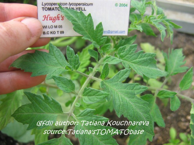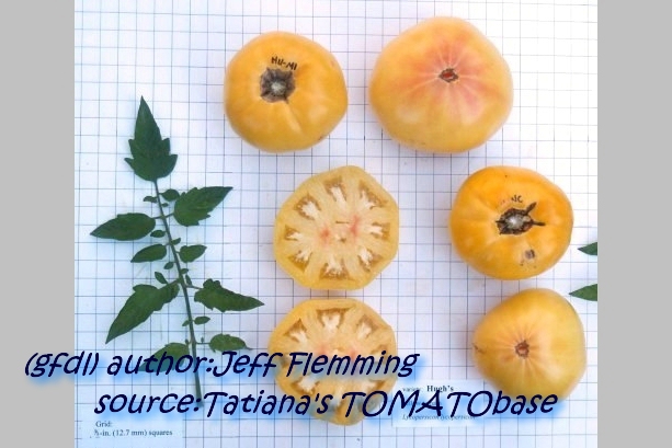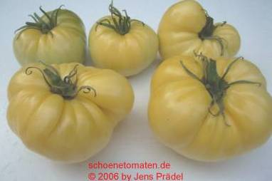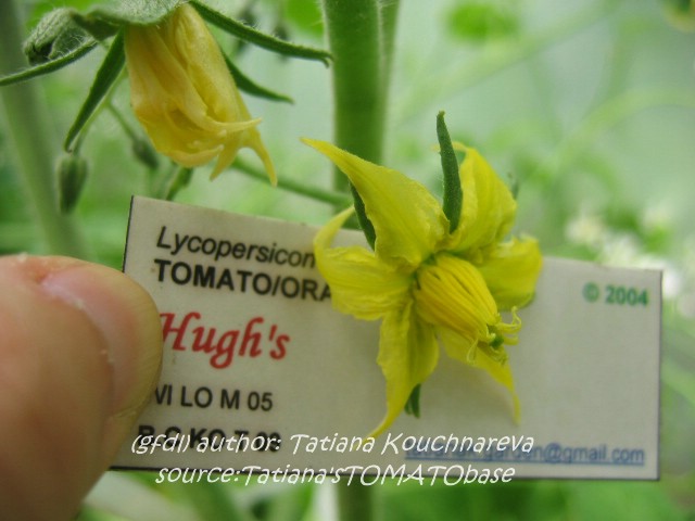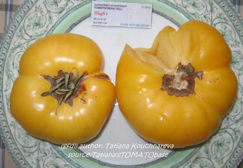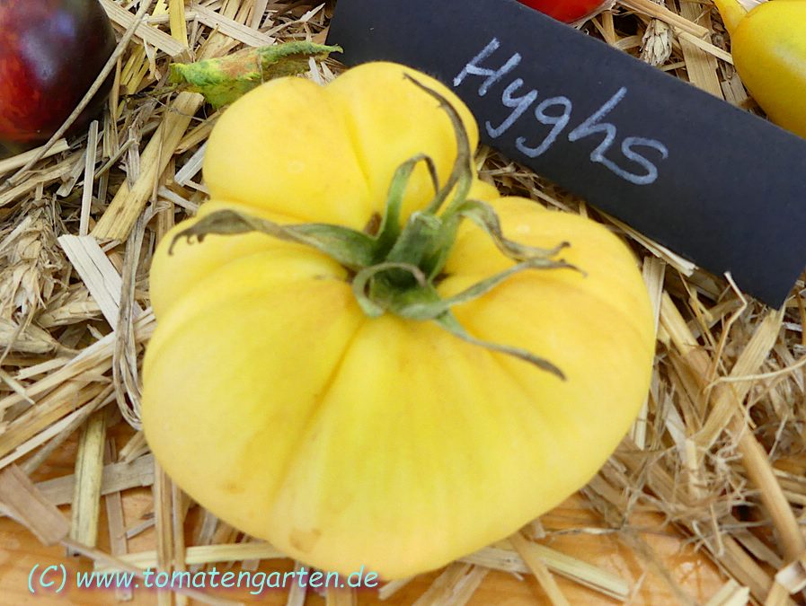 Hugh's - mittelgroße Pflanze (bis 2 m) extrem später Erntebeginn (Mitte September) trotzdem noch guter Ertrag überwiegend sehr große, plattrunde, gerippte, hellgelbe, fast weißliche Früchte größte geerntete Frucht: 399 g köstlicher saftiger Geschmack eine tolle Sorte! (Quelle: www.schoenetomaten.de)
