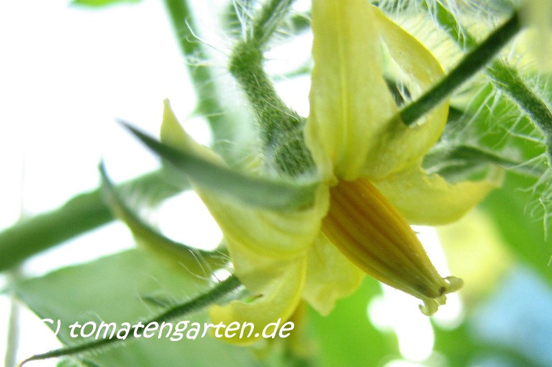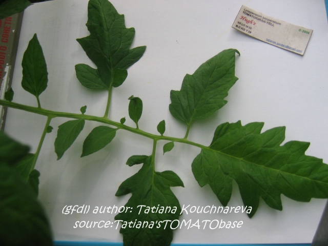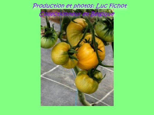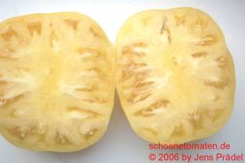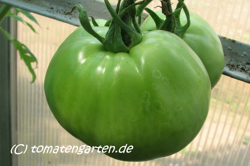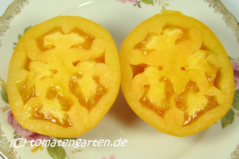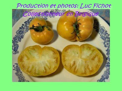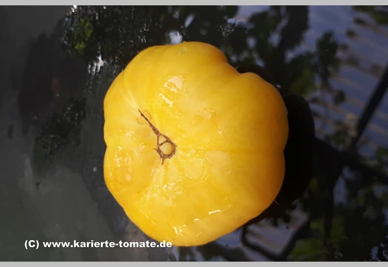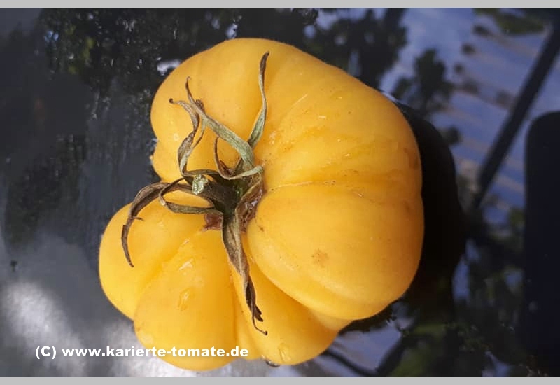 Hugh's - mittelgroße Pflanze (bis 2 m) extrem später Erntebeginn (Mitte September) trotzdem noch guter Ertrag überwiegend sehr große, plattrunde, gerippte, hellgelbe, fast weißliche Früchte größte geerntete Frucht: 399 g köstlicher saftiger Geschmack eine tolle Sorte! (Quelle: www.schoenetomaten.de)