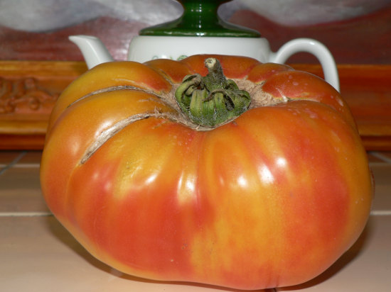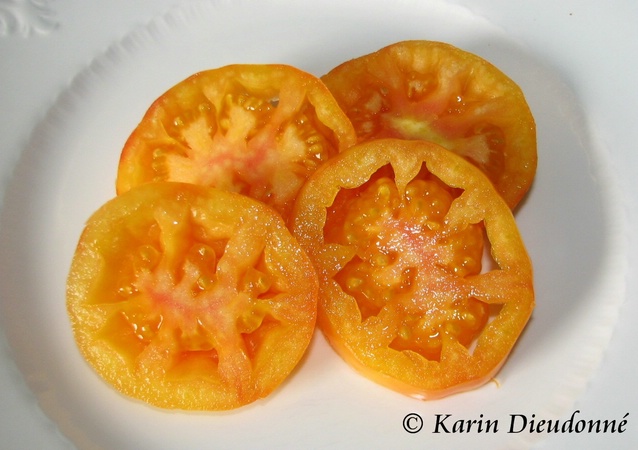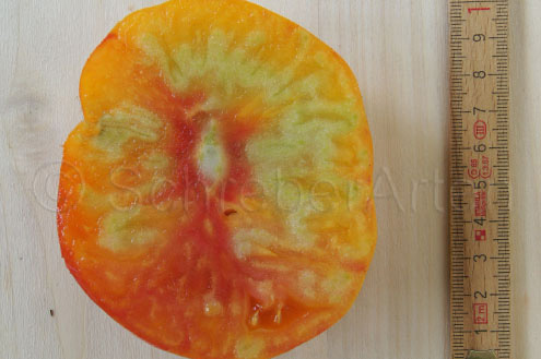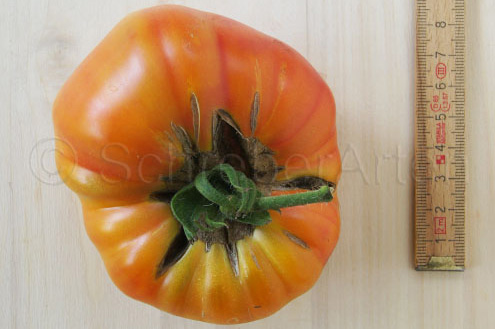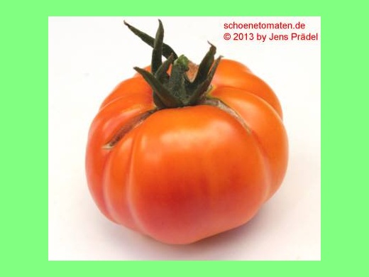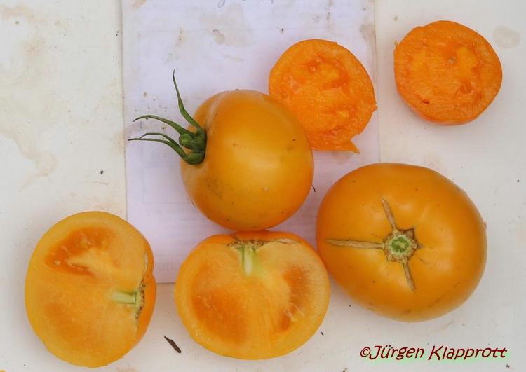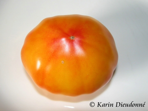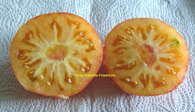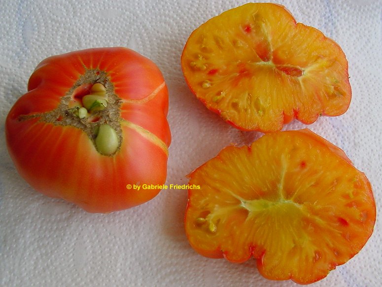 mittelgroße, breitrunde, kaum gerippte, gelborangene Früchte mit rot gefleckten Bäckchen und rotem Fruchtboden
