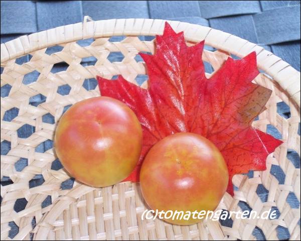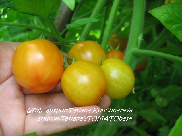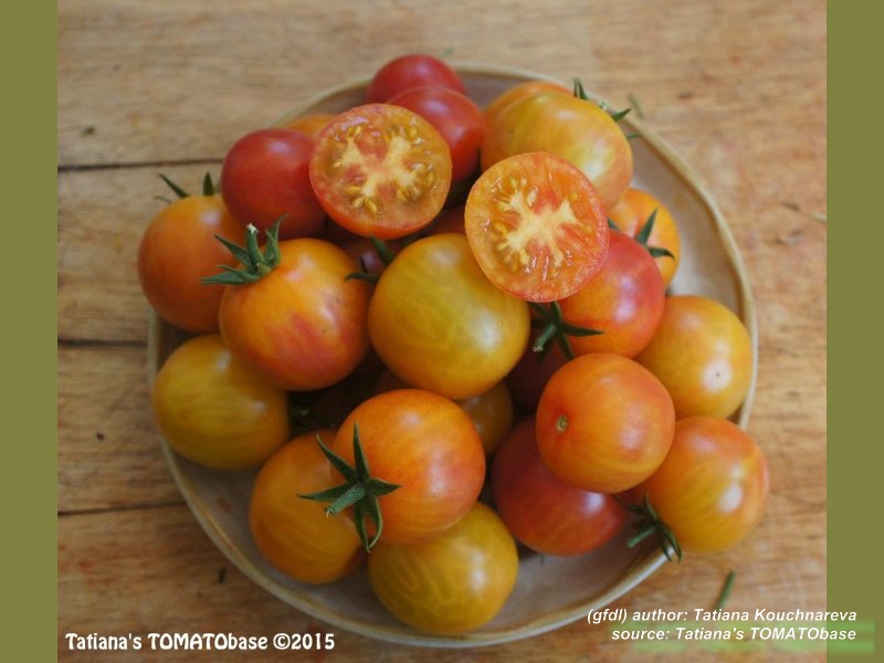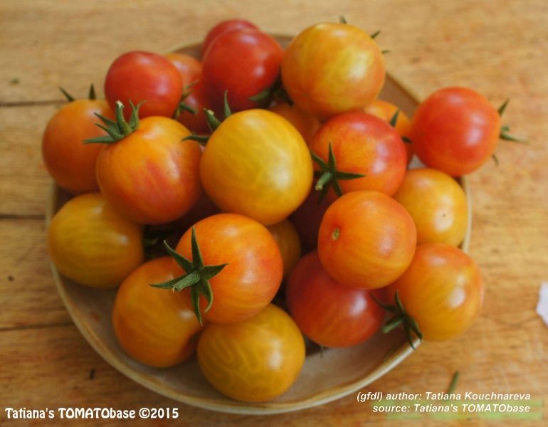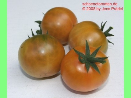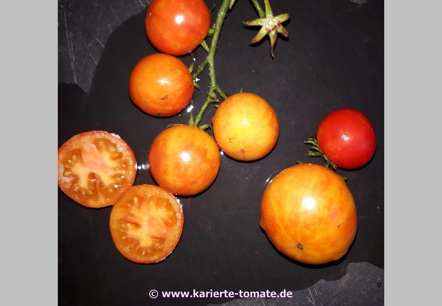 Isis Candy - orange/gelb-rote (mit roten Flecken) runde kleine (ca. 3-4 cm) Früchte mit leicht säuerlichem Geschmack; Reife ab Mitte August; hoher Ertrag. (Quelle: www.d-landsmann.de / Mit freundlicher Genehmigung des Autors)