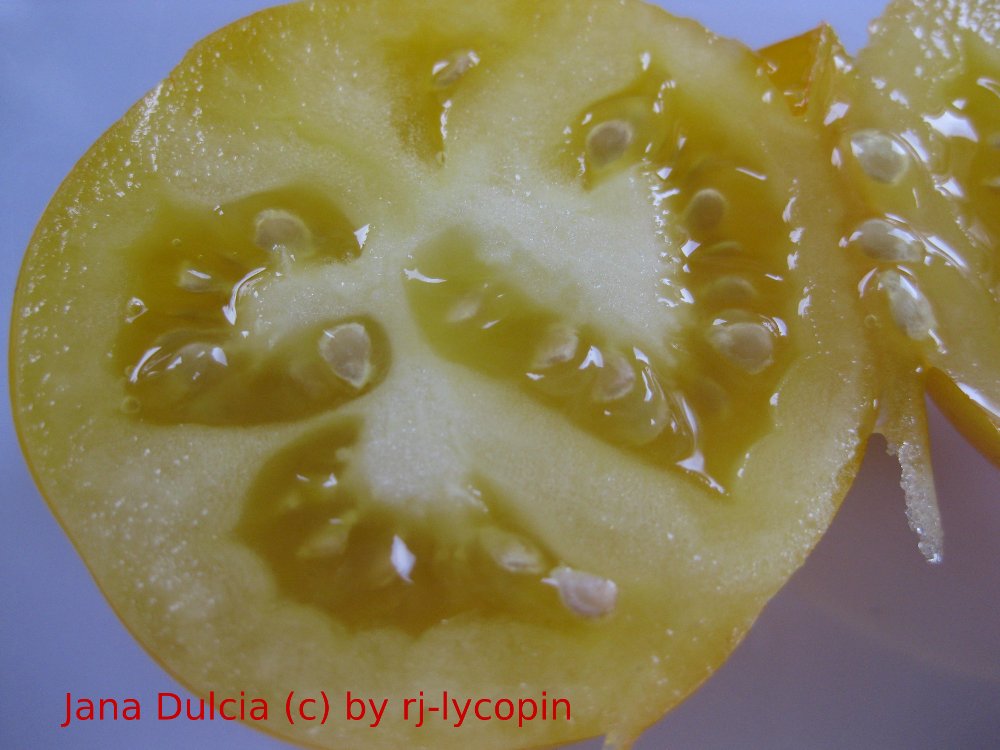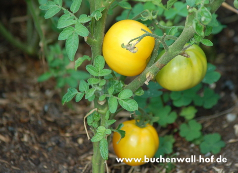 Die robuste Buschtomate 'Jana Delicia' (Höhe max. 1,00m, eher niedirger) kann gut im Kübel auf dem Balkon gezogen werden. Sie ist recht witterungsbeständig und damit auch für Tomatengärtner interessant denen kein Gewächshaus zur Verfügung steht. Ihre Früchte sind gelb, mild, süß und im Durchschnitt etwa 90g schwer. Die Sorte stammt aus Tschechien.