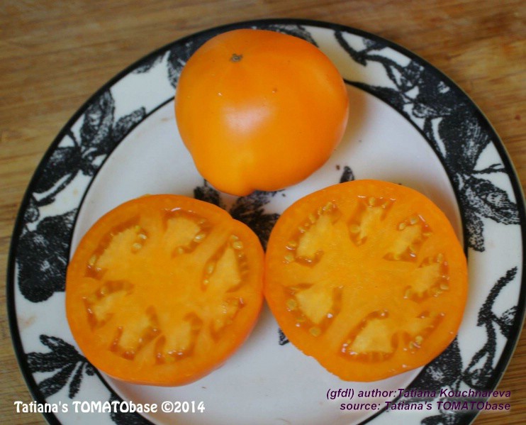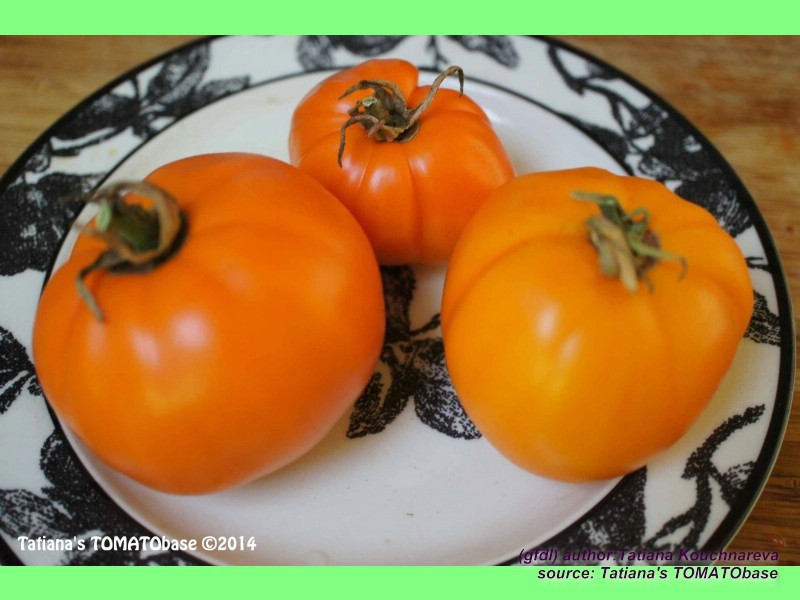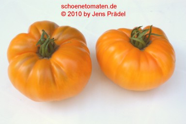 große, einheitlich breitrunde, etwas unregelmäßig gerippte, orangefarbene Früchte