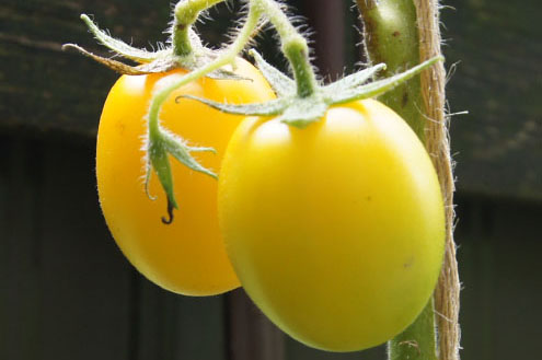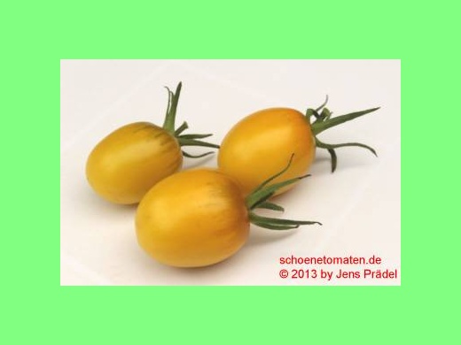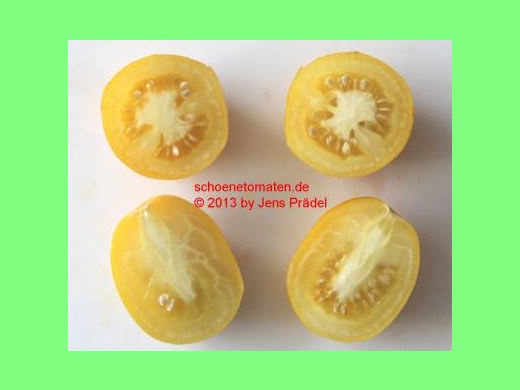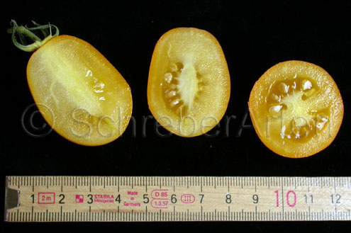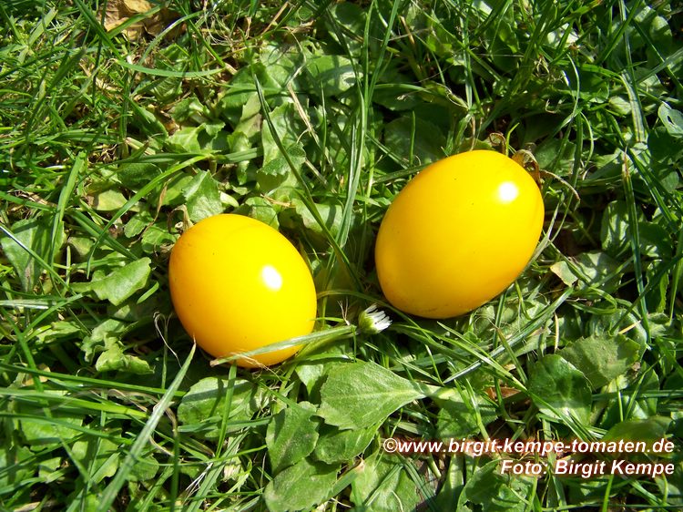 kleine, eiförmige (4 bis 4,5 cm breit und 5 bis 6 cm hoch), zweikammrige, gelbe Früchte