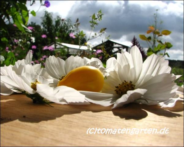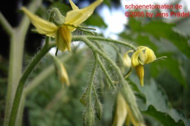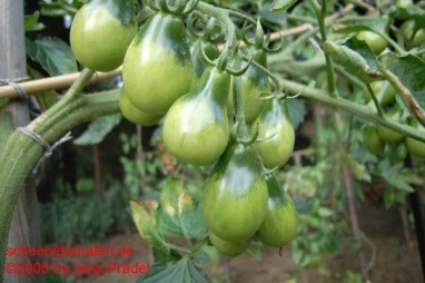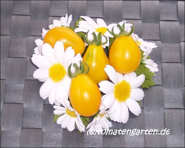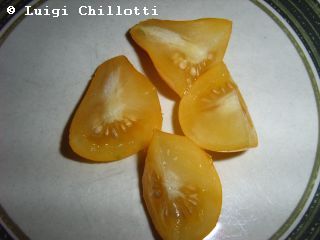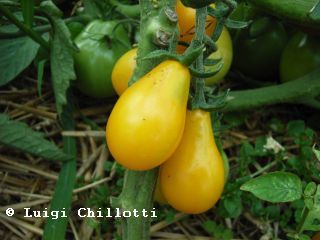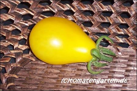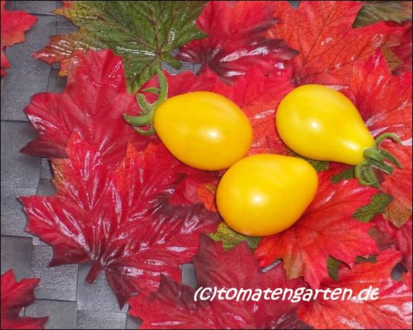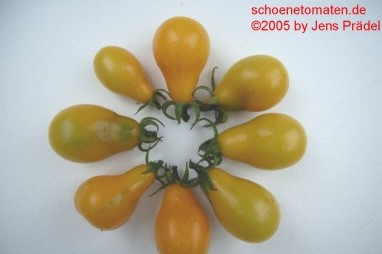 Japan Golden Pear - sehr große Pflanze (2,5 bis 3 m) mit schlankem Wuchs sehr später Erntebeginn (Ende August) guter Ertrag kleine (10 bis 18 g), birnenförmige, gelbe Früchte süßlicher, milder Geschmack, aber etwas mehlig untere Blätter verfärbten sich erst gelblich, dann vertrockneten sie (Quelle: www.schoenetomaten.de)