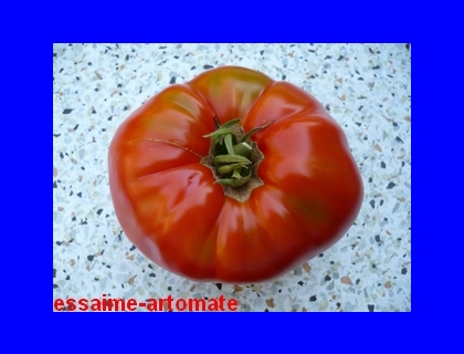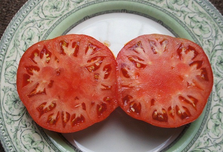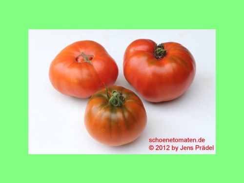 gleichmäßig große (ø 9 bis 10 cm, 6 cm hoch), breitrunde, glatte, kräftig rote Früchte