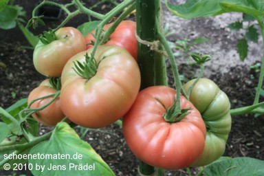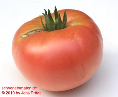 große, breitrunde, nur leicht gerippte, fast glatte, rosarote Früchte