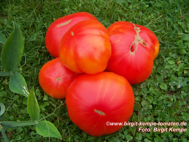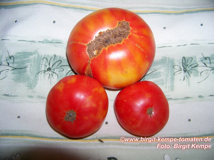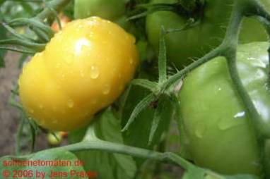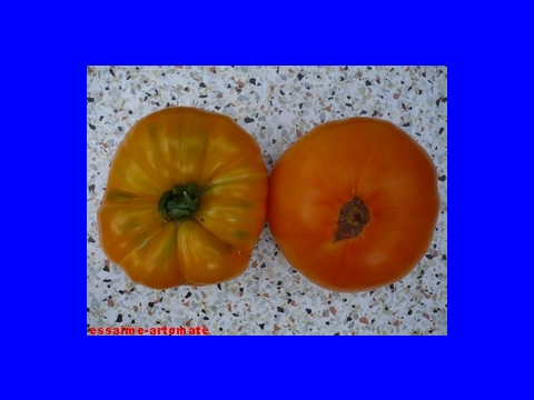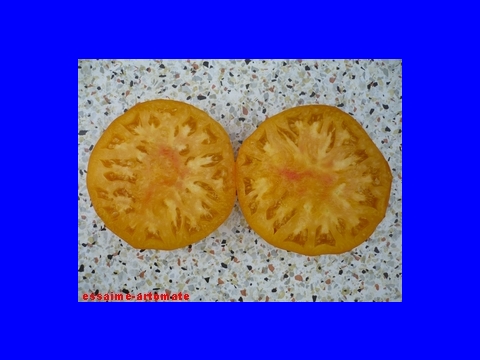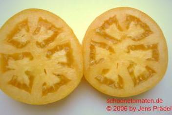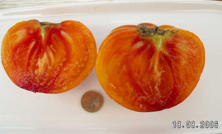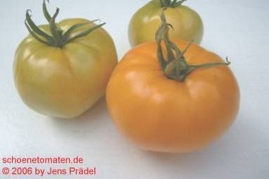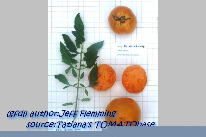 Kazahk Schalavije - mittelgroße Pflanze (1,5 bis 2 m) später Erntebeginn (Ende August) ertragreich große (150 bis 200 g), runde bis flachrunde, kaum gerippte, dunkelgelbe bis orangefarbene Früchte sehr leckere, attraktive (Querschnitt!) Früchte (Quelle: www.schoenetomaten.d