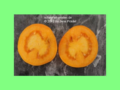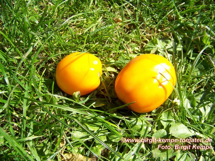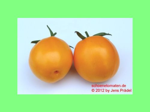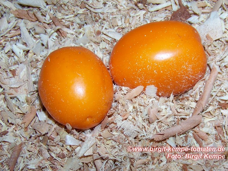große (ø ca. 5,5 bis 6 cm, 7 cm hoch, 70 bis 90 g), leicht hochrunde, glatte, orangefarbene Früchte