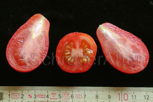 deutlich grösser als rote Birnchen, "trockene" Tomate für Saucen und Ketchup