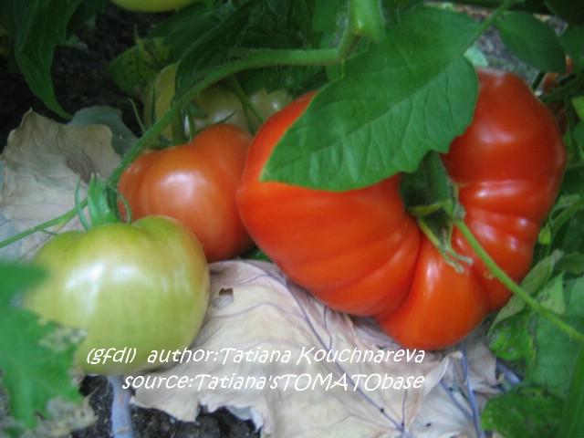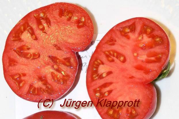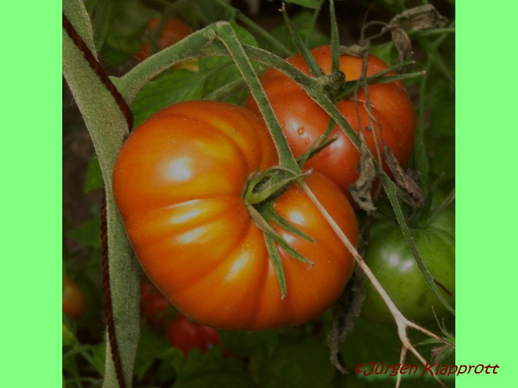 2018 erstes Mal im Gewächshaus angebaut .Ertrag gut .Früchte so 100-500g .Wenig gerippt .Haut und Fleisch fester als bei Berner Rose .Milder Geschmack .Geringe Säure .