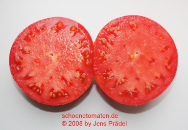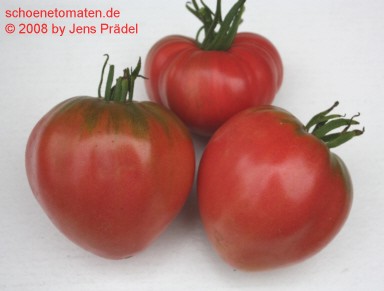 große, runde (mit stumpfer Spitze), herzförmige, rote Früchte mit grünlichen Kappen