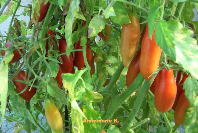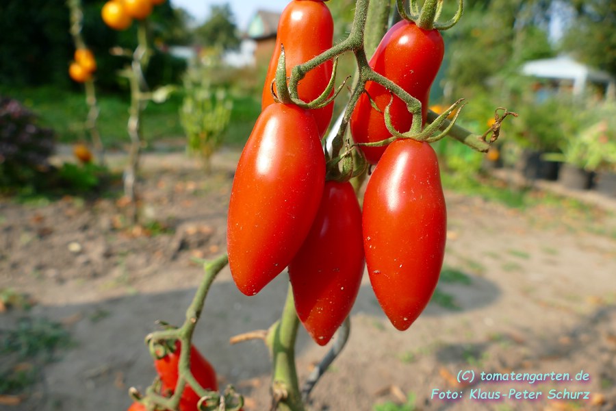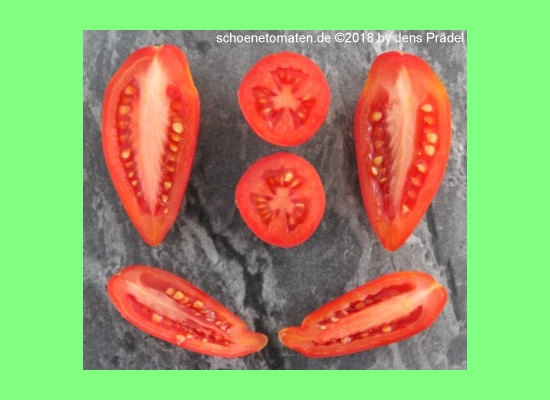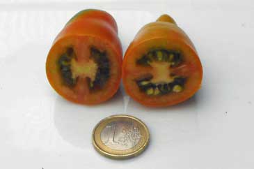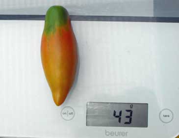 Die Sorte hat zwar eine interessante Form, schmeckte bei uns roh aber wirklich fade, gekocht als Soße war der Geschmack besser. Ein weiteres Problem: Die Früchte fallen teils noch unreif von der Pflanze ab. Relativ späte Reife: Dauer von der Blüte bis zur Frucht 75 Tage