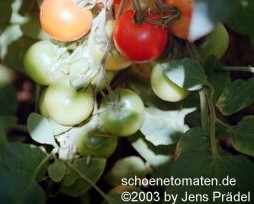 Lunch Bucket - sehr große Pflanze (bis 3 m) später Erntebeginn (Mitte August) ordentlicher Ertrag mittelgroße (ø 4 bis 5 cm), runde, rote Früchte weitausladende Rispen angenehmer Geschmack (Quelle: www.schoenetomaten.de)