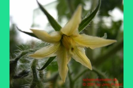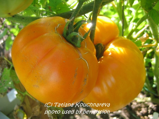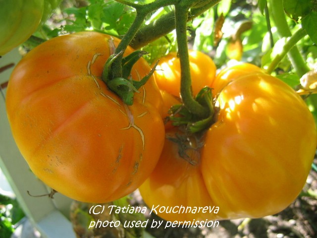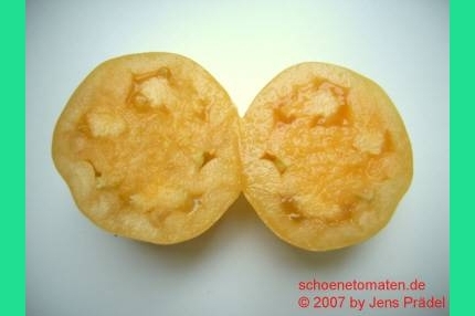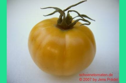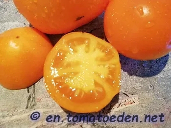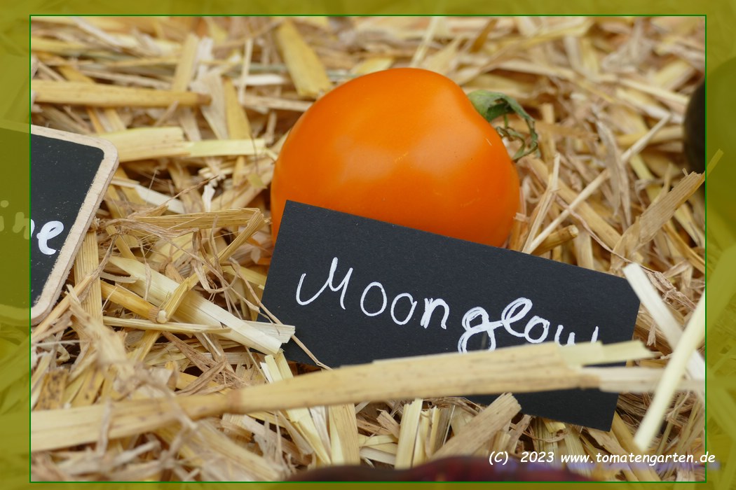 Moonglow - kleine Pflanze (bis 1,5 m) extrem später Erntebeginn (Ende September) geringer Ertrag große (ø 6 cm), 60 bis 80 g schwere, leicht breitrunde, dickwandige, orangegelbe Früchte saftig, fleischig und mild im Geschmack (Quelle: www.schoenetomaten.de)