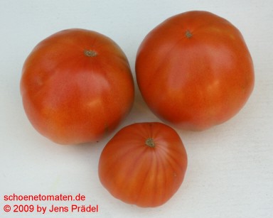 große bis sehr große (ø bis 10 cm), auffällige, wuchtige, überwiegend hochrunde, tonnenförmige, aber auch breitrunde und herzförmige, kaum gekerbte, rote bis leicht braunrote Früchte