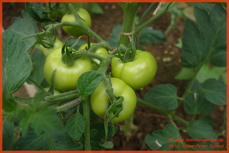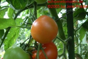 Moneymaker - sehr große (bis 3 m) kräftige und gesunde Pflanze mittelfrüher Erntebeginn (Mitte August) gewaltiger Ertrag mittelgroße (70 bis 120 g), runde, hellrote Früchte normaler Tomatengeschmack (Quelle: www.schoenetomaten.de)