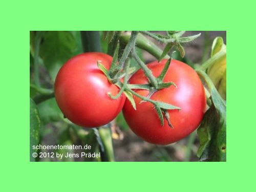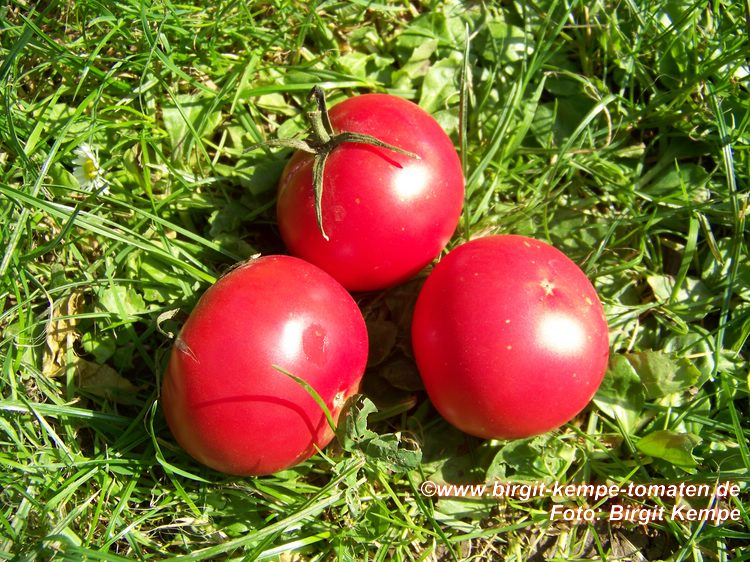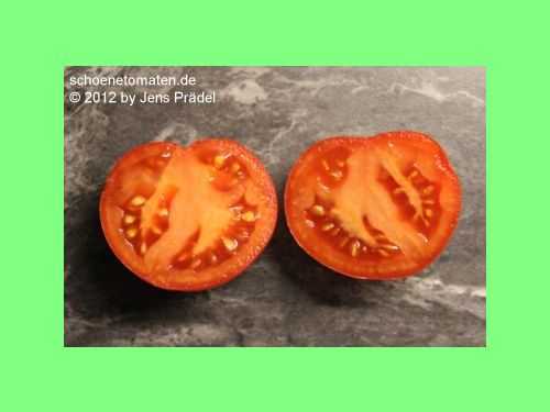 mittelgroße (ø ca. 4,5 bis 6 cm und meist 60 bis 100 g schwer), runde bis leicht breitrunde, glatte, leuchtend rote Früchte, die aufgeschnitten lachsfarben aussehen