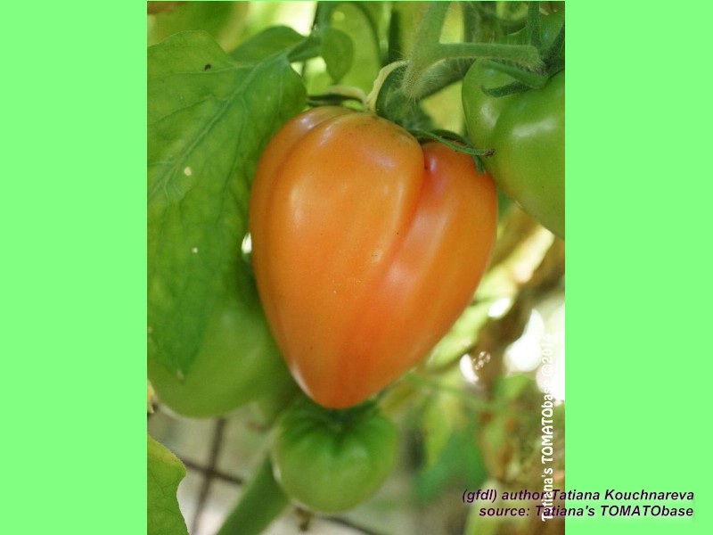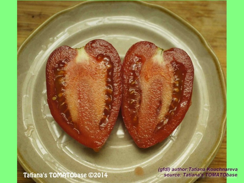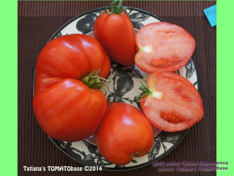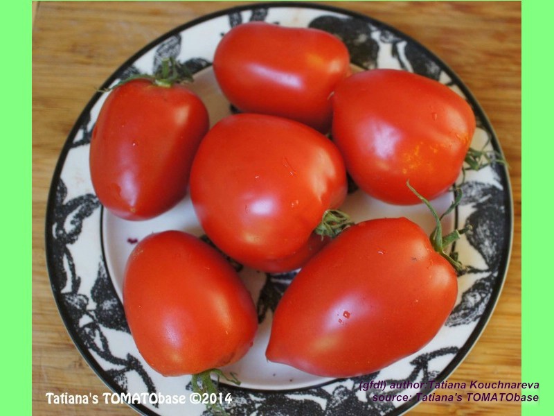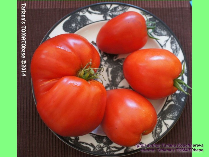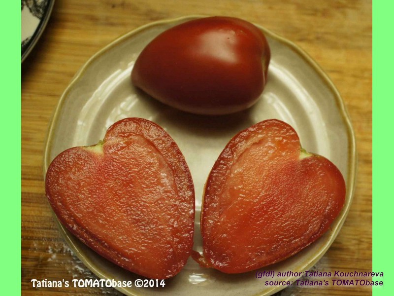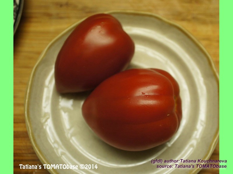 mittelgroße (6 bis 7 cm breit und 7 bis 8 cm lang), zapfenförmige, seltener auch herzförmige, rote Früchte mit kleiner, stumpfer Spitze