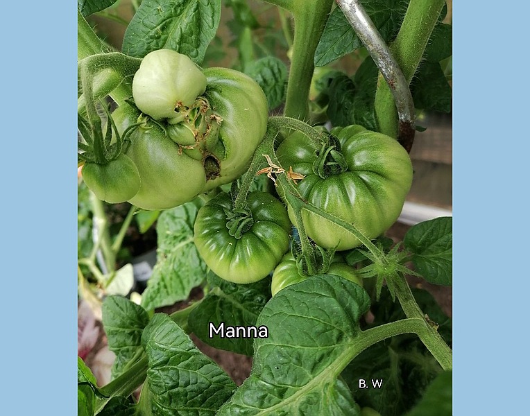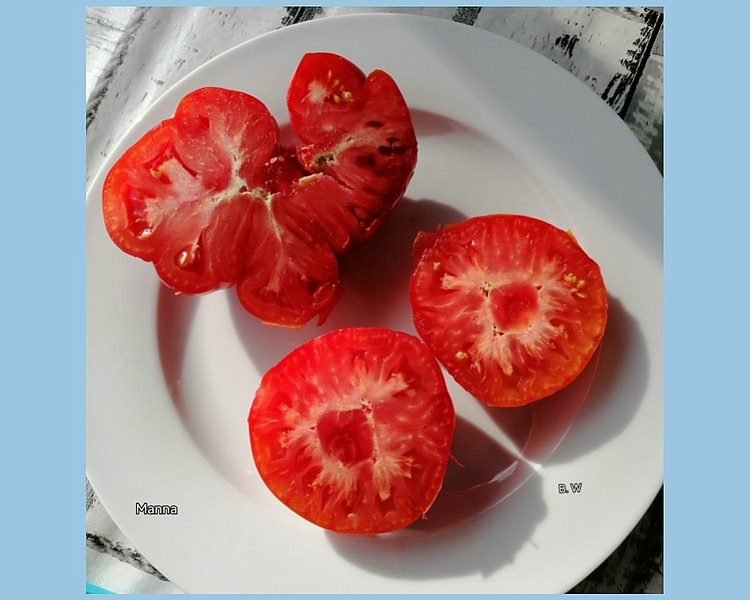 Manna hat unterschiedliche Fruchtgrössen von 20g bis 400g, die Wuchshöhe variiert von 1,20m bis 1,80m ,ist Samtfleckenresistent