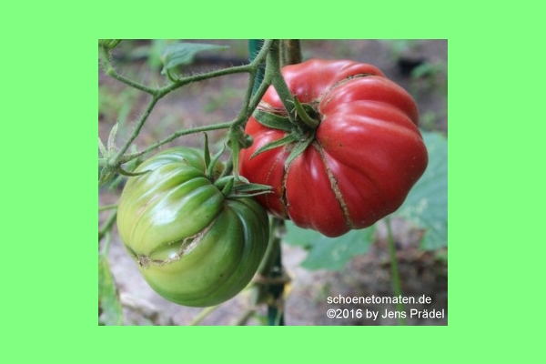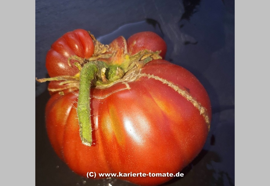 große bis sehr große(ø 9 bis 11 cm, 6 bis 7 cm hoch), unförmig breitrunde, klobig wirkende, leicht gerippte, rote Früchte