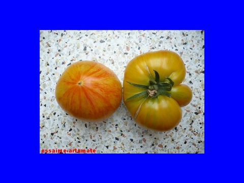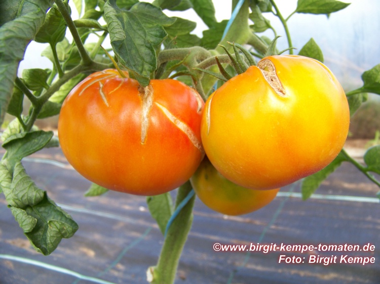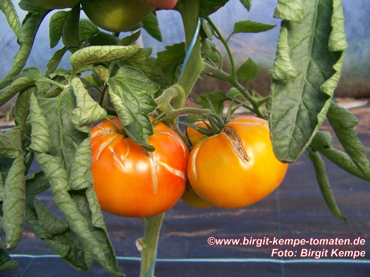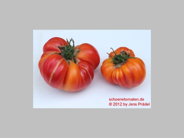 mittelgroße bis große, breitrunde, oft etwas unförmige, gerippte, dunkelrote Früchte mit breiten orangefarbenen Streifen