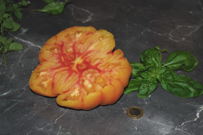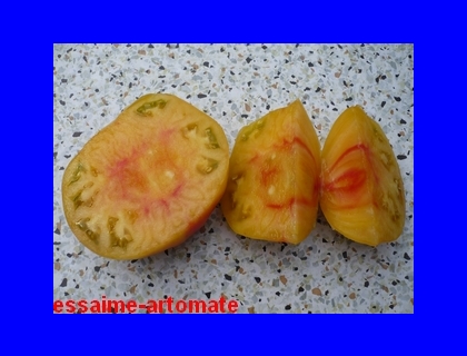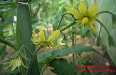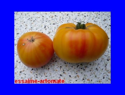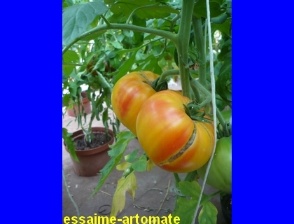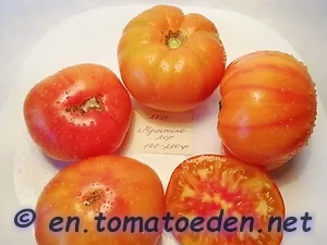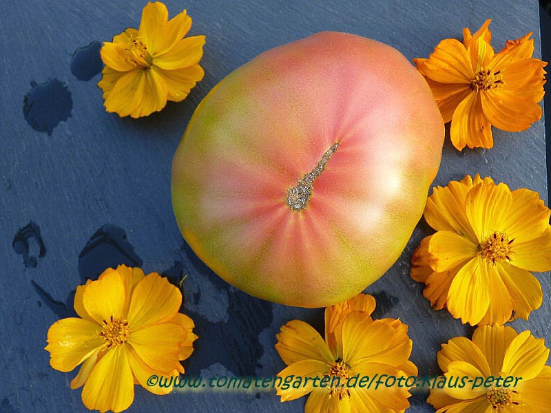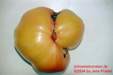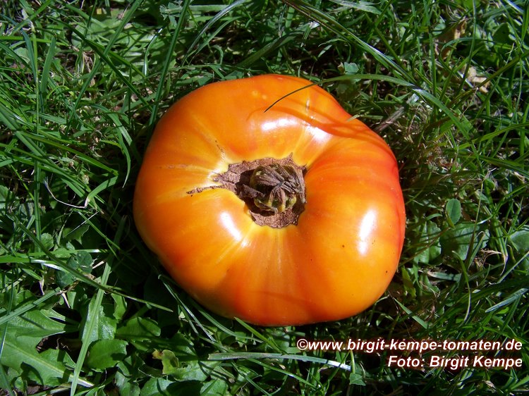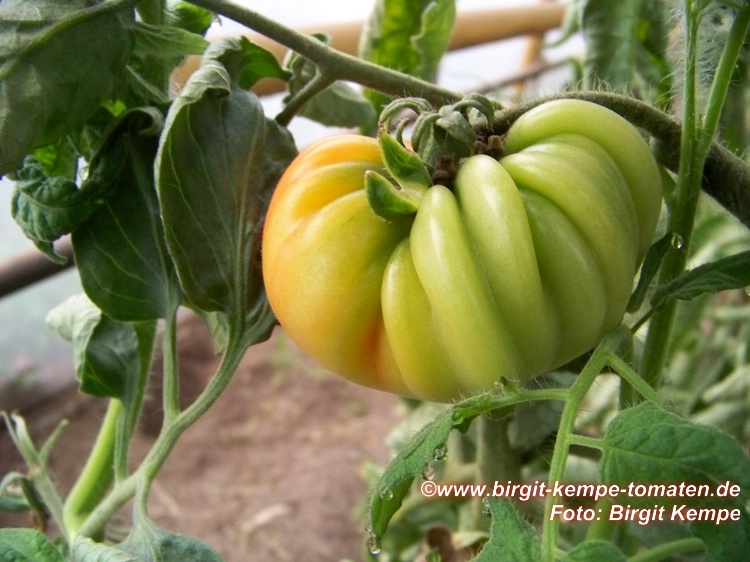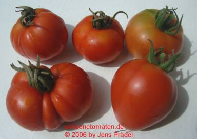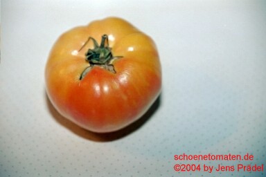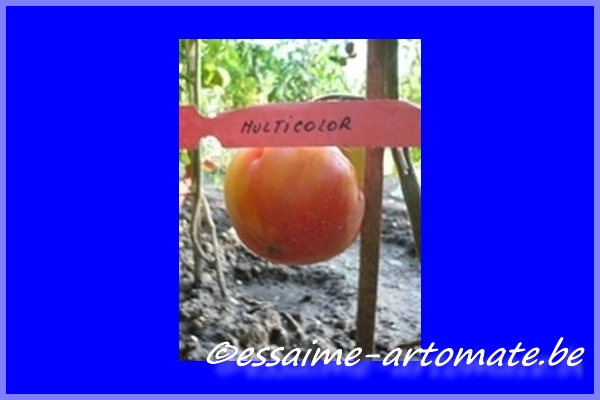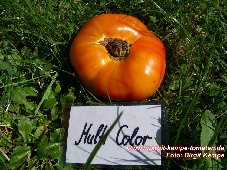 Multi Color - mittelgroße Pflanze (bis 1,5 m) 2004: extrem später Erntebeginn (Anfang Oktober!) 2006: mittelfrüher Erntebeginn (Mitte August) geringer bis durchschnittlicher Ertrag aber sehr große, runde, gelborangene Früchte mit zum Fruchtboden hin sternförmigen roten Streifen 2006 waren die Früchte eher rot mit orangefarbenen Flecken und unterschiedlichen Formen in einer Traube: sowohl breitrund gerippt als auch herzförmig saftige, leckere Sorte (Pflanzen hatten 2004 keinen optimalen Standort) (Quelle: www.schoenetomaten.de)